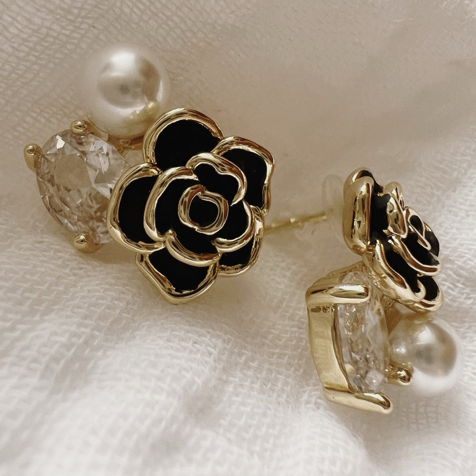 BRAND NEW! Camellia Stud Earrings Gold Plated Stainless Steel Pearl CZ Elegant and feminine, these camellia stud earrings are crafted in gold-plated stainless steel for durability and shine. Featuring a black enamel camellia flower, each earring is adorned with a sparkling cubic zirconia stone and a delicate faux pearl. Perfect for adding a touch of timeless elegance to any outfit. • Condition: New without tags • Metal: Gold-plated stainless steel • Design: Camellia flower with black enamel detailing • Accents: Cubic zirconia and faux pearl • Style: Stud earrings • Closure: Push-back • Size: Approx. 1.8 cm x 1.5 cm • Inspiration: Iconic camellia motif, vintage Chanel style • Nickel-free & tarnish resistant Tags: camellia earrings, gold plated earrings, black enamel earrings, pearl stud earrings, CZ earrings, stainless steel earrings, vintage style earrings, Chanel inspired, flower stud earrings, camellia jewelry, elegant earrings, dainty earrings, timeless jewelry, gold floral earrings, faux pearl earrings