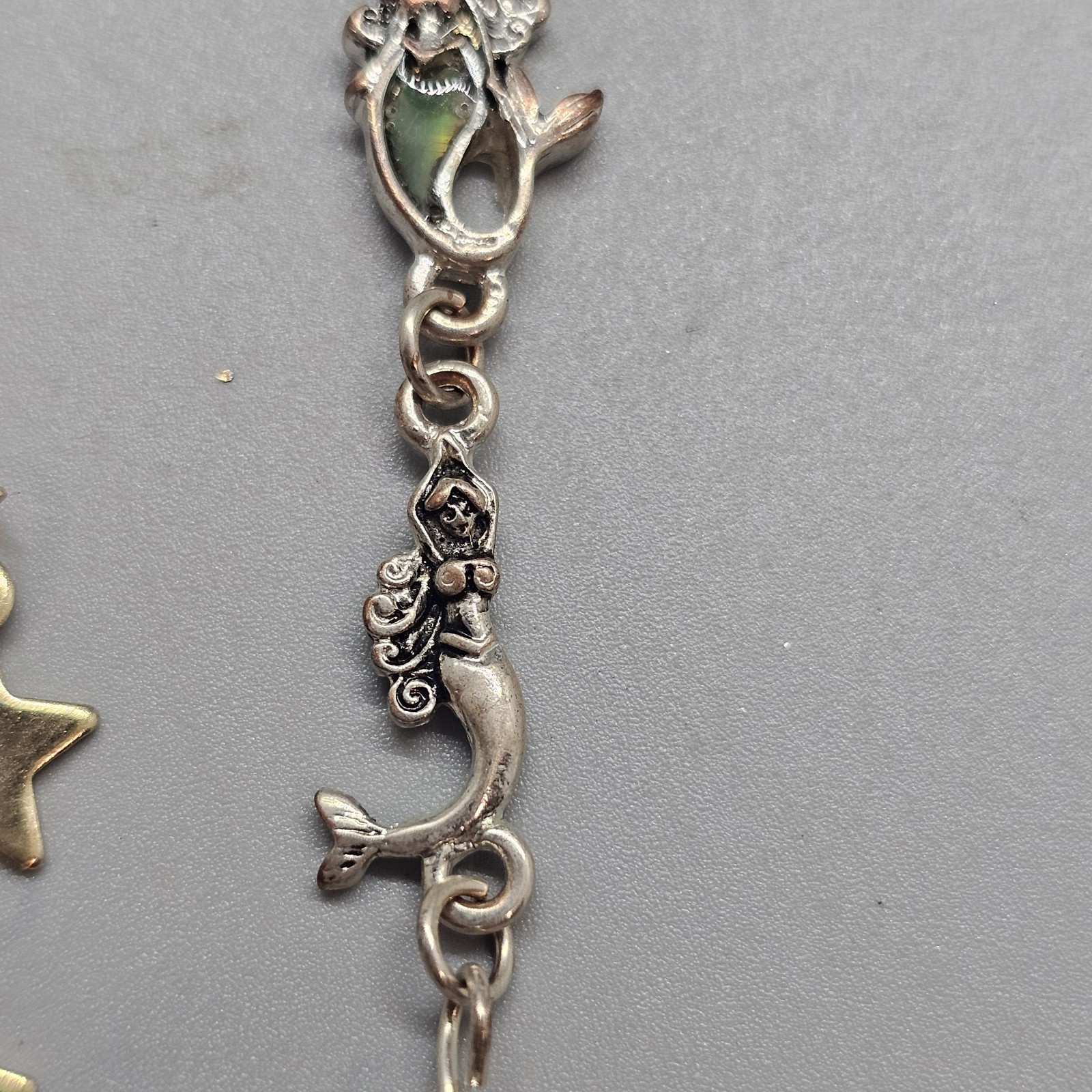 This product is a lot of gold and silver tone mermaid and star themed bracelets, anklets, and wrist accessories adorned with rhinestones. The brand of the items is silver, with a focus on gold color and material. The pieces are designed with a fun and whimsical mermaid and star motif, making them perfect for adding a touch of glamour and personality to any outfit.