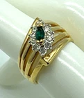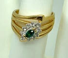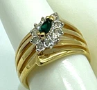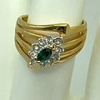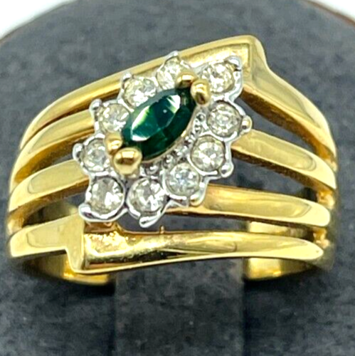 18Add a touch of elegance to your style with this stunning cocktail ring. The ring features a spread design with four gold rows with a glittering greenv crystals in the center.The dark green crystal is the centerpiece, surrounded by clear crystals, creating a beautiful contrast. The prong setting style adds an extra touch of sophistication to this piece, making it perfect for any occasion. Crafted from high-quality gold tone metal, this ring is both durable and stylish. The ring size is seven, and it will fit comfortably on any finger. Whether you're dressing up for a special event or adding a touch of glamour to your everyday look, this ring is the perfect accessory. Bin R 353