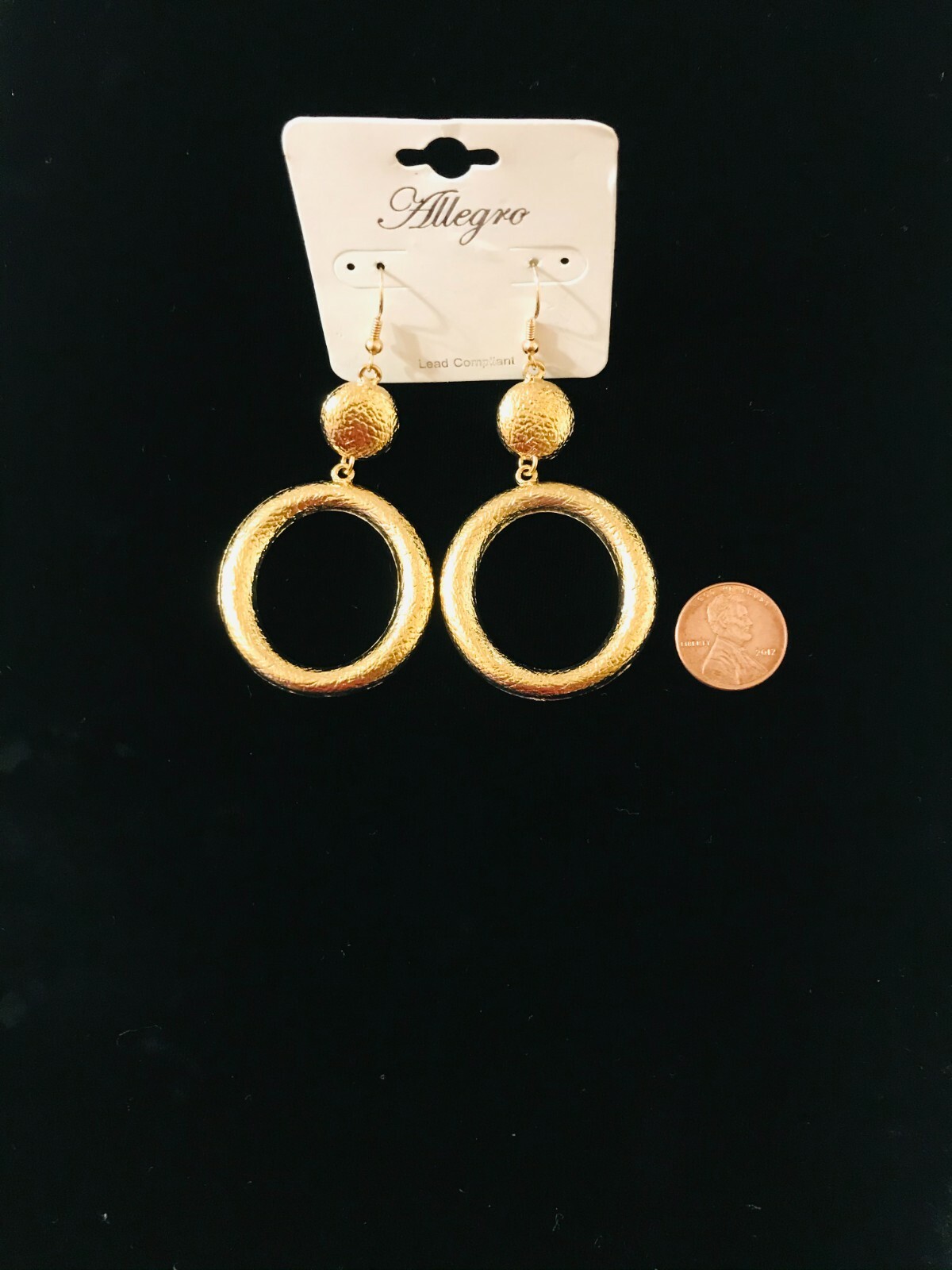 Allegro gold-tone hoop earrings. They are nice and shiny with a textured design. Medium Gold-Tone Hoops 1.3/4" Wide French Wire I try to describe every item as accurately as I can. Please review the photos as they are a part of the description. What you see in the photos is what you will be getting. If you need additional information or have a question, please, please do not hesitate to send me an eBay message. I will be happy to respond. Thank you for taking time out of your busy schedule. Please visit my eBay Store - Prescott Gifts at www.ebay.com/str/marviolet - for more interesting items to choose from. ****International Buyers - Please Note Import duties, taxes, and additional charges are not included in the item price or shipping cost. These charges are you the buyer responsibility. Please check your country's customs office to determine what additional costs will be, prior to bidding or buying an item**** Thank you.
