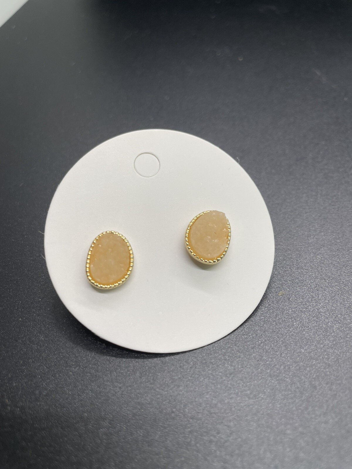 This is a nice pair of Stud Earrings Gold Tone Rim Beige Rock Crystals Please view all photos to see approximate measurements and different views. Good pre-owned condition. The colors may vary slightly depending on lighting and/or computer monitor. Please use the zoom tool to take a close look at the piece. Pictures are part of the description. Measurements are shown in the pictures. If you have any questions about the product, please contact MsVix. We are happy to answer any inquiries. Thank you for being the best part of our business.
