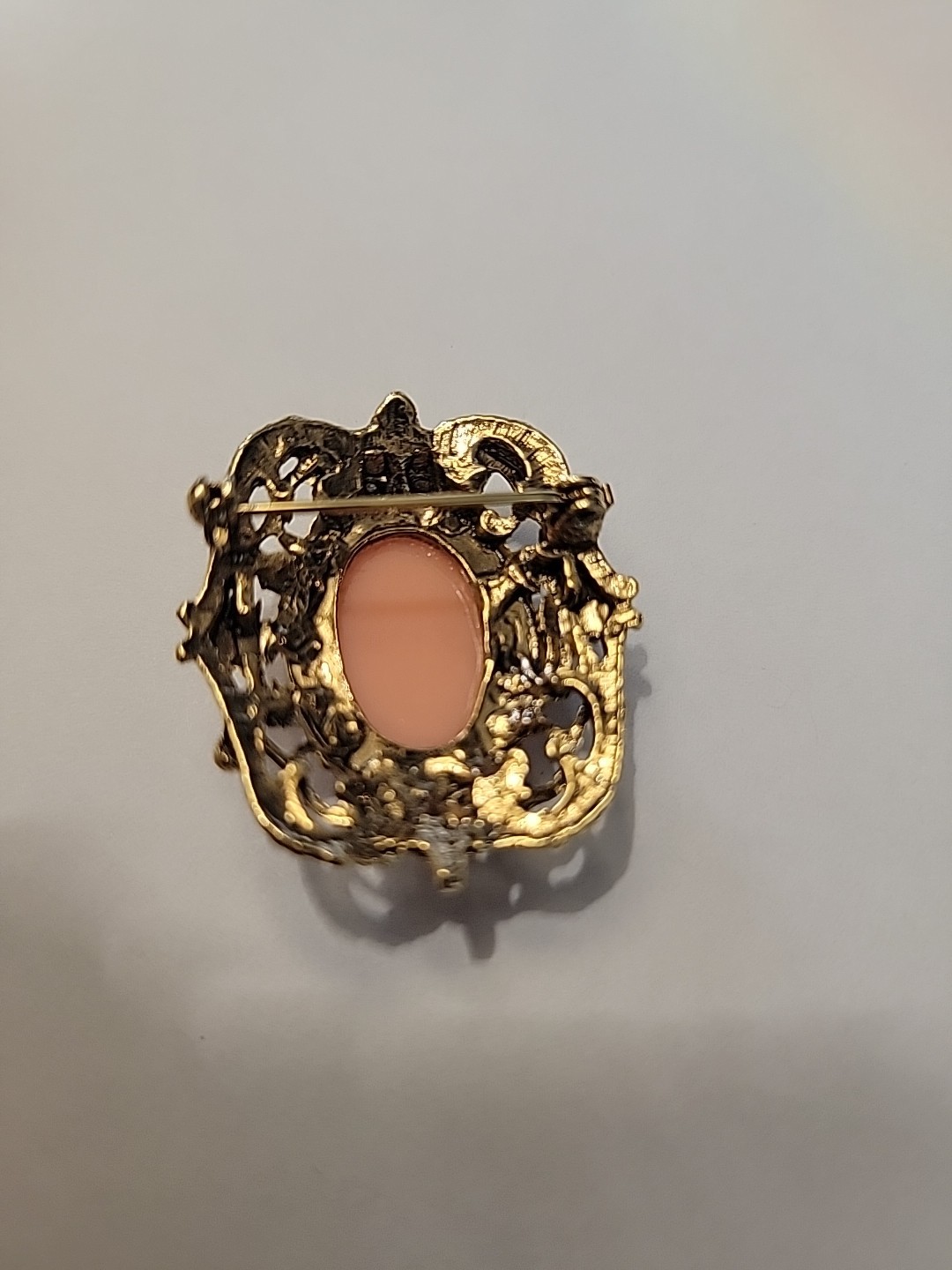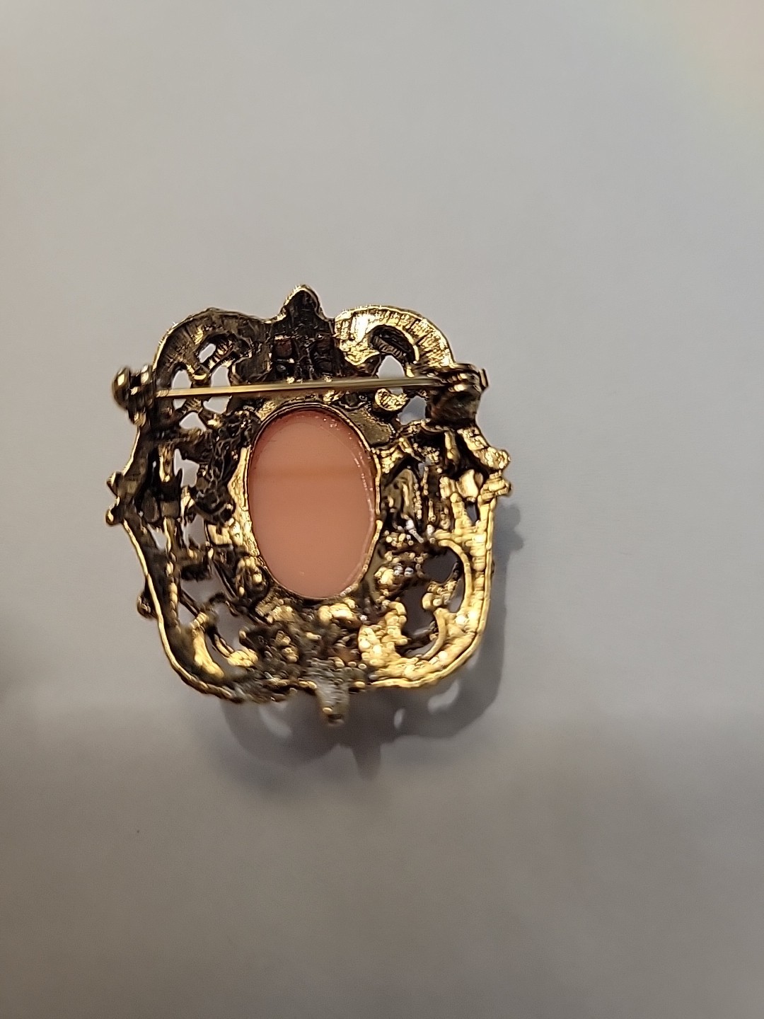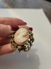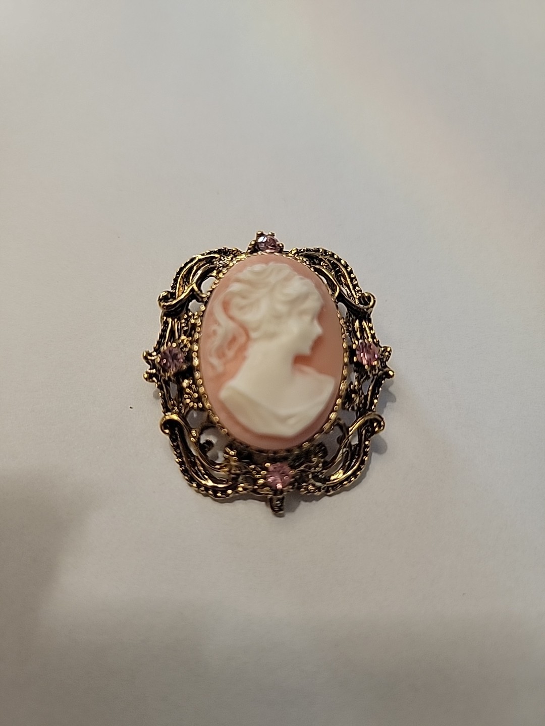 This Gold Tone Cameo Brooch with Pink Rhinestones is a piece perfect for a Mother's Day or birthday gift. The oval-shaped pink cameo set in gold tones with pink rhinestones adds a touch of elegance to any outfit. The fashion-forward brooch is ideal for women who appreciate classic and timeless jewelry pieces.