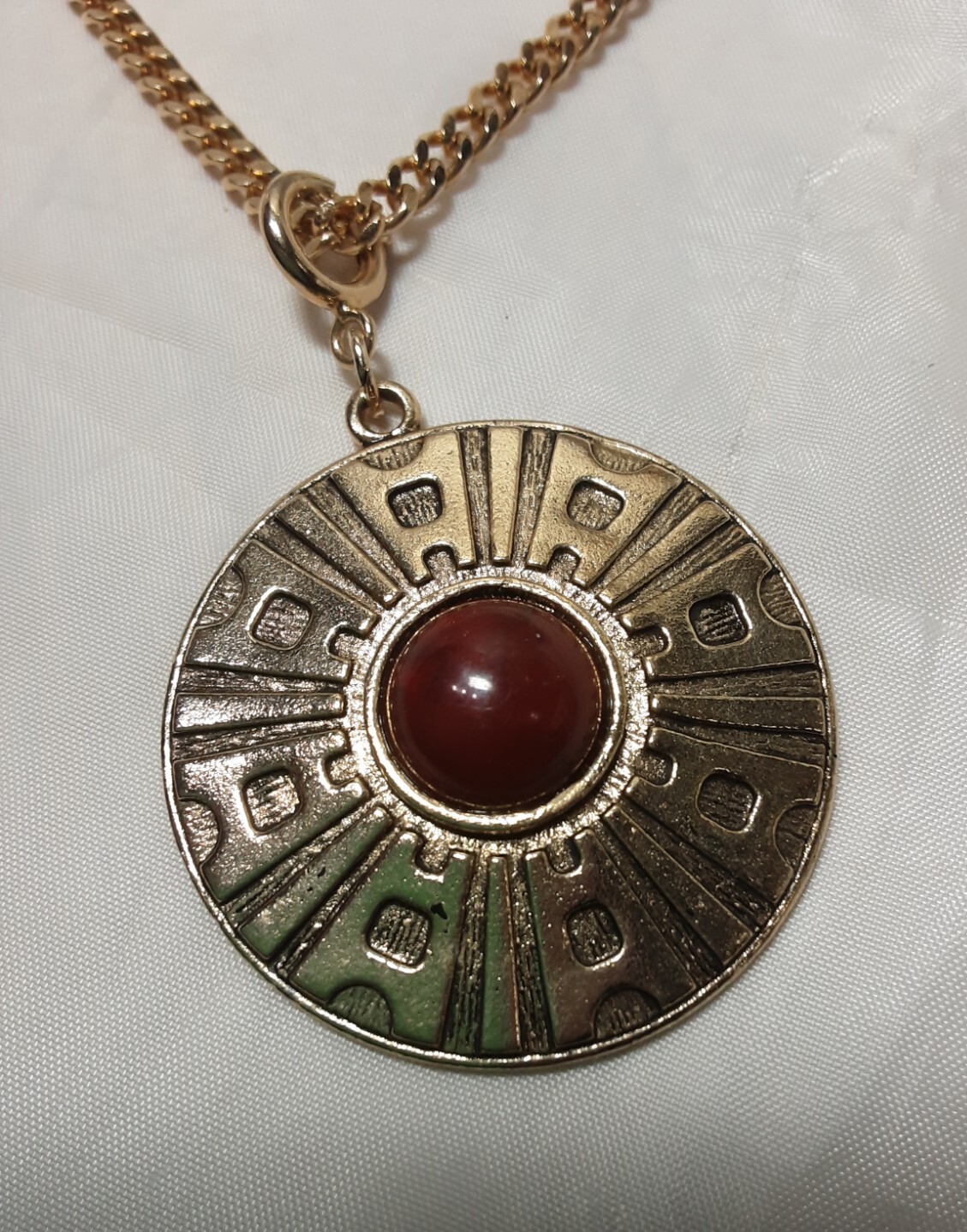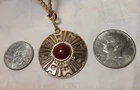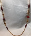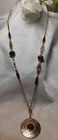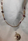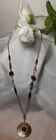 VINTAGE SIGNED SARAH COVENTRY GOLDTONE CHAIN WITH DEEP RED BEADS WITH ROUND ASTEZ DESIGN RED CENTER REMOVABLE PENDENT. WEAR IT WITH OR WITHOUT. EXCELLENT CONDITION. BEADS ARE A DEEP RED WITH A LITE SWIRL OF BLACK. CRANBERRY COLOR. DK31