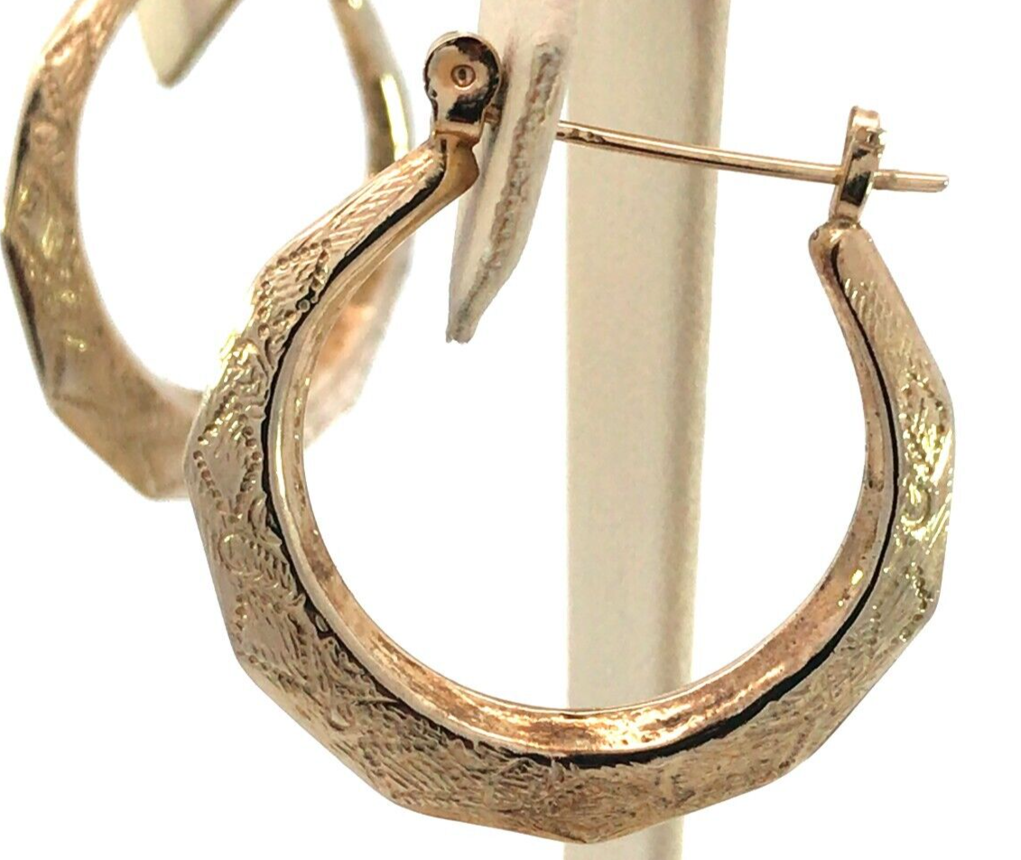 These designed hoop earrings are very pretty. They are done in gold tone and if you look at picture #4 you can see the design. They hang just a bit over 1" and they will make a nice addition to your earring collection No Returns!