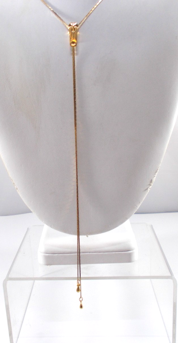 This lovely gold tone lariat necklace can be worn up to 22". It has a fine cobra chain and features a zipper to adjust length. The ends of the necklace have small gold tone teardrop dangles. The piece is unsigned. Gift boxed. Shipping is included. For additional purchases made at the same time, a combined shipping $1.00 discount on each additional item will be refunded. To combine shipping on items that have different shipping cost methods (flat rate, shipping included, calculated shipping), exact weight of package will calculated and excess shipping will be refunded.