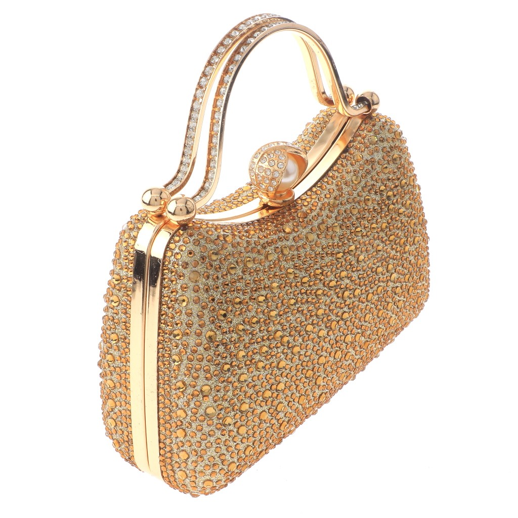 Gold Tone Metal Frame Crystal Rhinestone Fashion Clutch Evening Bag / Satin Fabric / Metal Handle with Pearl / Both Sides Rhinestone / Long Chain Strap / Approximate Size: 7.5"L x 5"H x 3"W / Color: Gold Condition: Brand New SKU: BZY249-GLD Color: Gold Design: All orders will ship from USA via UPS or USPS. We expect all local orders will receive the items within 7 business days or less depend the location. Worry free international shipment delay or custom duty fee.