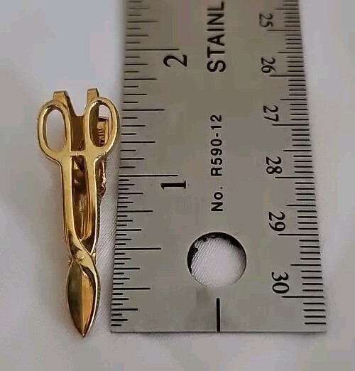 This vintage tie clip is a great addition to any collection. The gold tone and tailor sewing design make it a unique piece that will stand out. Made for men and crafted from gold plated material, this tie clip is of high quality and will surely make a statement. With its classic 1960s style, it is perfect for any occasion and can be passed down for generations to come. The item length is 1 1/2" making it perfect for any tie. This tie clip is a must-have for any fashion-forward individual.