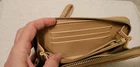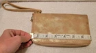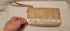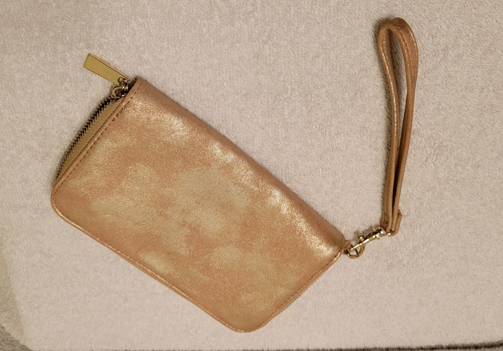 This Gold Wristlet Clutch Bag is a stylish and practical accessory for women. The small rectangular shape features a zip closure with gold hardware accents, adding a touch of elegance. The beige wrist strap and coated finish make it easy to carry around, while the lined interior provides a safe space for your essentials. Perfect for a night out or a special occasion, this clutch is a must-have for any fashion-forward woman.