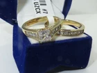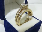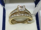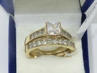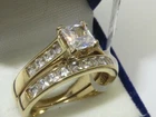 2 PCS WEDDING ENGAGEMENT RING SET AAA GRADE SIMULATED DIAMONDS PRINCESS CUT Total pure quality 18KT YELLOW GOLD ELECTROPLATE AND STAINLESS STEEL WILL NOT TARNISH AND STAMPED NO GREEN FINGER Center Stone Name: AAA Grade CZ AAA Grade CZ is a manmade stone, in which its refractive index, dispersion and hardness is extremely close to those of a natural diamond. It also creates more flashes of color, giving it a fiery and brilliant appearance. Center Stone Color: Clear Center Stone Size: 5,5(mm) Stone Cuttings: Square Weight(approx): 5.40(g)