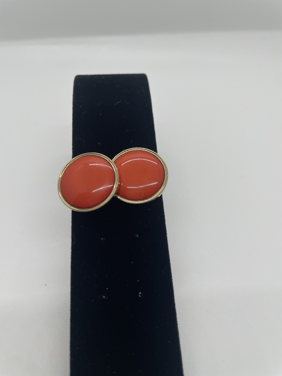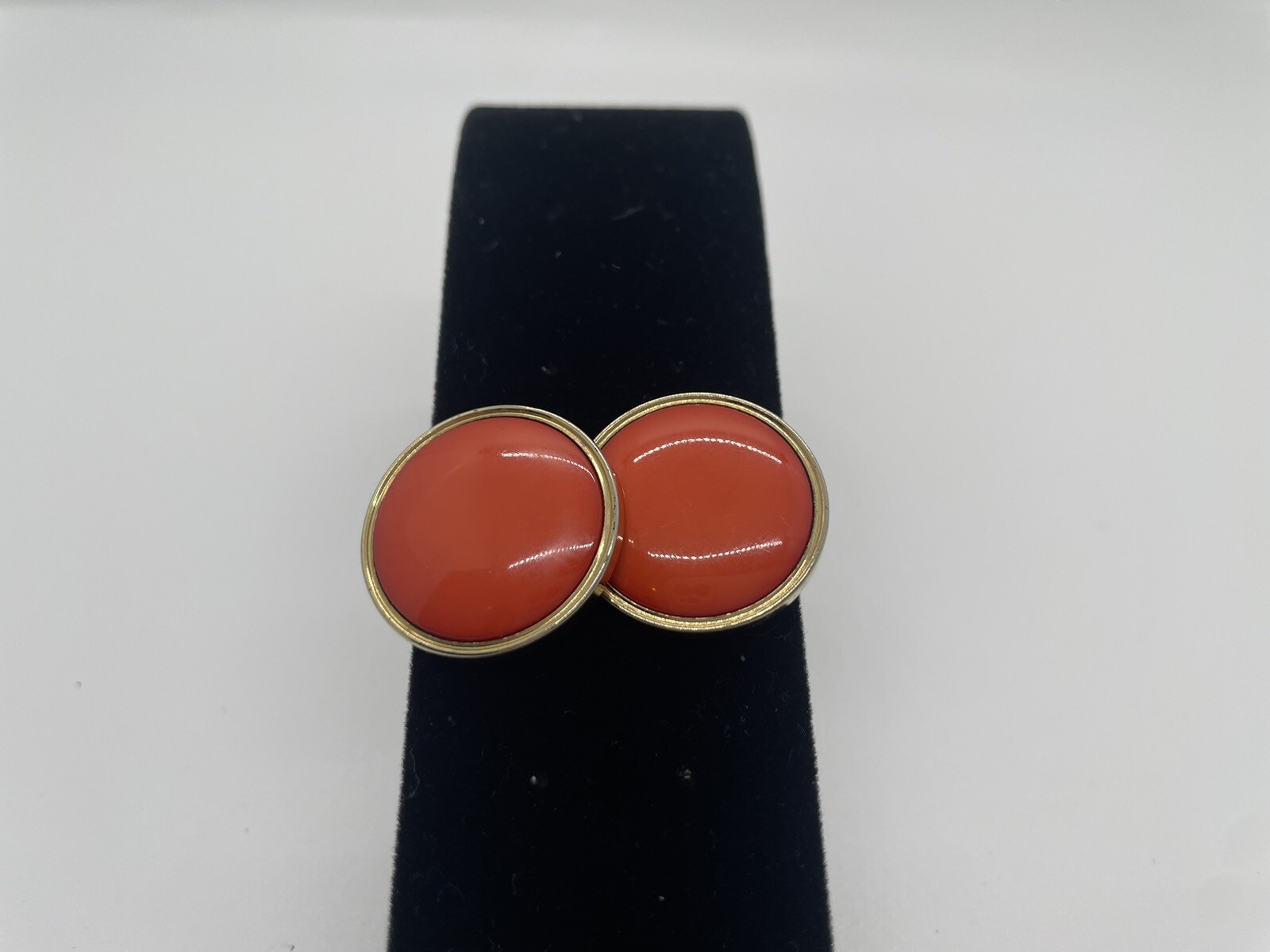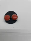 This is a Circle Stud Earrings Gold Tone Rim Orange Raised Center Please view all photos to see approximate measurements and different views. Good pre-owned condition. The colors may vary slightly depending on lighting and/or computer monitor. Please use the zoom tool to take a close look at the piece. Pictures are part of the description. Measurements are shown in the pictures. If you have any questions about the product, please contact MsVix. We are happy to answer any inquiries. Thank you for being the best part of our business.