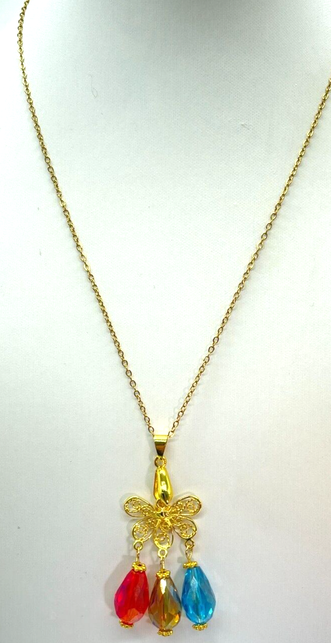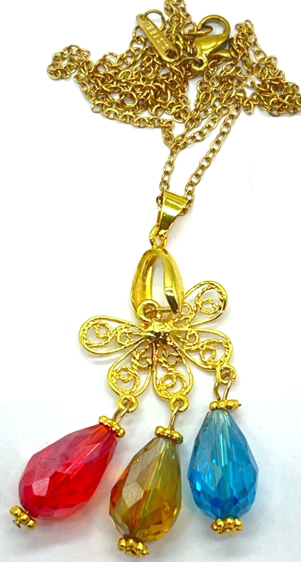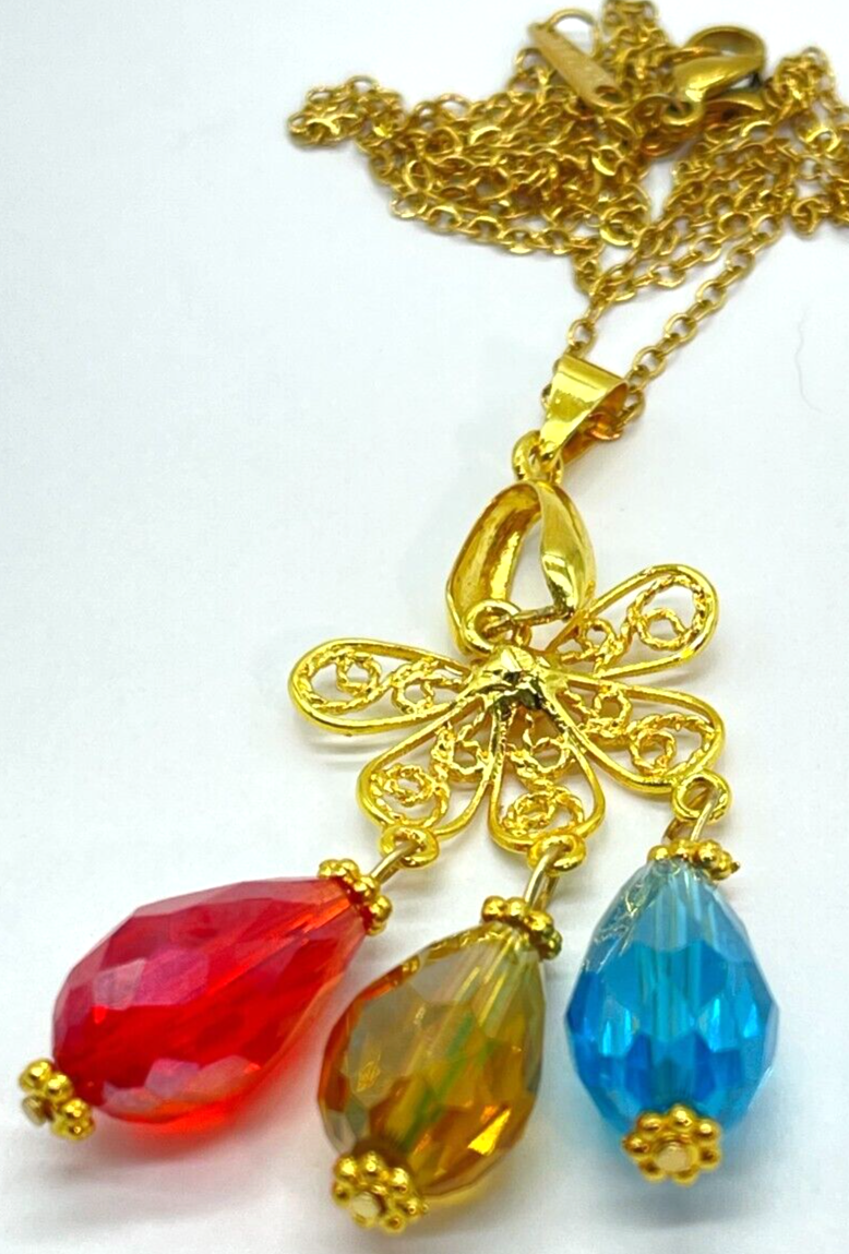 Elevate your ensemble with this captivating gold tone necklace, featuring vibrant red, blue, and yellow glass teardrop charms that exude a playful yet sophisticated charm. The pendant's elegant teardrop shape and multi-colored accents make it a versatile accessory perfect for any occasion, whether you're dressing up for a night out or adding a splash of color to your daytime look. The necklace spans an appropriate 18 inches in length with an additional 2-inch extension for a comfortable and adjustable fit. Designed to make a statement without overwhelming your outfit, this unbranded piece is a testament to fashion-forward thinking, effortlessly blending bohemian flair with classic beauty. Bin N 228