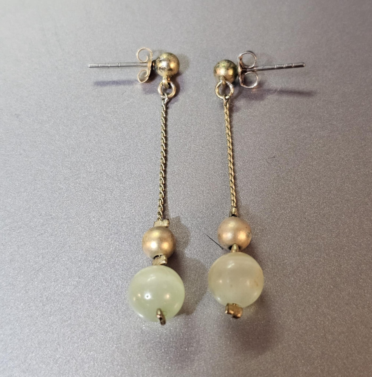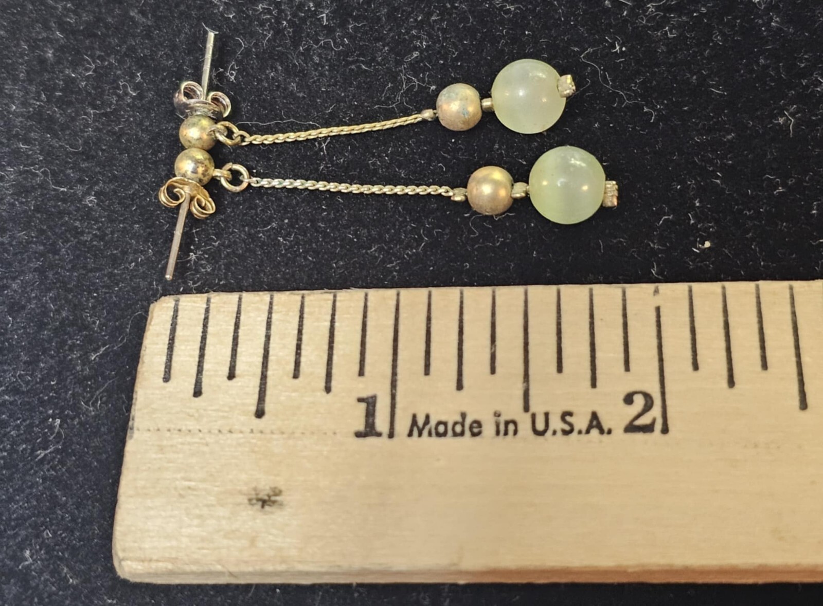 Goldtone Stud Earrings w/ Dangling green stone & goldtone beads -READ- S85 Both have signs of wear on the gold beads. See all photos as part of the description. Thank you. S85