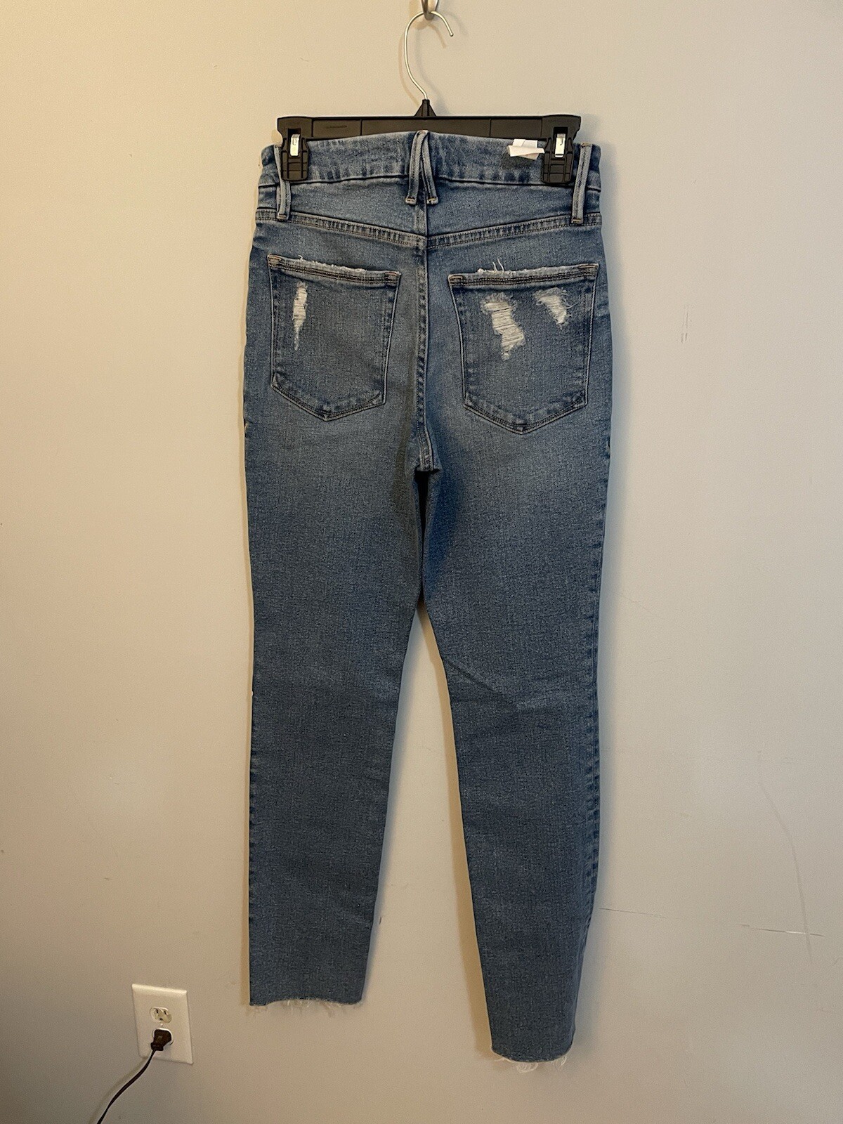 Good American Good Vintage Fray High Rise Straight Leg Jeans in Blue Denim, size 4/27. These jeans feature a zip fly with button closure, a 5-pocket design, and a 28-inch inseam. Made of cotton and elastane, they have a medium fabric wash and a regular fit. The distressed style adds a casual and vintage touch, perfect for a festival, Y2K, streetwear, or 90s-themed look. Machine washable for easy care.