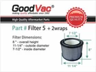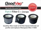GoodVac Replacement Filters for Filter Queen 4000 Defender Air Purifier - HEPA Filter & 2 Pre-filter Wraps Product Description GoodVac HEPA Filter Cartridge 4000 Compatible with Filterqueen Defender Air Purifier GoodVac brand replacement which meets or exceeds OEM specifications Will work with following Defender air filtration units: Rac4000 AM4000 Defender 360 80th Anniversary D360 7500 Specifications: Dimensions - 8 inches high, 7 and 1/2 inches inside diameter 11 and 1/4 inside diameter Upper and lower rings/seals made out of rubber for air tight fit. Removes 99.97 % of particles as small as .3 micron On inside Reinforced with steel mesh. Here is timer reset instructions: Turn on the unit on low speed. Press BOTH (Up and Down) arrow buttons till red light starts blinking While the red light is blinking press both buttons once more Red light should be off and it will start blinking again in 11 months. Maintenance: Replace every year for optimum performance. Activated carbon wrap/pre-filter (sold separately) replace every 6 months This is a product branded by GoodVac. This is not an OEM product and not covered under any manufacturer's warranty. Any brand names and logos are the registered trademarks of their respective owners and are used solely for purposes of demonstrating compatibility. Payment and Delivery Items must be paid for within 3 days from purchase date. FREE shipping with tracking within continental US. Each aditional item Ships at NO CHARGE! AK, HI and the rest of the World - actual UPS or US Postal Service shipping plus $5.00 handling fee. Guarantee We guarantee items to be undamaged and in good working order. NO warranty on supplies and/or parts that customers install themselves. Missing parts or components - please check packaging material again. If you still believe that something is missing - please contact us within 7 days after receipt of the item. Broken right out of the box – please contact us within 7 days after the item was delivered. Please do not discard packaging as we may have to file claim with the shipping company. Returns Buyer may return the item within 30 days after receipt of the item. Buyer ships it back to us at his/her own expense. We will issue the refund within 1 week less 15% restocking fee. Item must be unused and with all original packaging and/or tags it came with. OUR EBAY STORE ABOUT US OUR FEEDBACK ADD US CONTACT US SUBSCRIBE Problem? Please CONTACT US and we will straighten it out. Inventory Most items are in our warehouse ready to be shipped next business day (see lead times for each individual item). 15+ years In parts and supplies business since 2002.