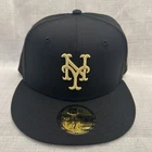 This is a New Era 59Fifty baseball cap featuring the New York Mets team in black and gold colors. It is made of polyester canvas material in a size 7 1/4. The cap is part of the MLB collection and suitable for unisex adults. It can be worn casually throughout all seasons and is not personalized or handmade.