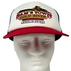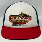 Vintage Sam's Town Gold River Hotel Gambling Hall Casino Laughlin Trucker Hat Baseball Cap Nevada 80s Red White Blue Yupoong Five Panel Mesh Snapback Will be shipped in a box. Condition: Has image cracking. No other flaws noticed. See photos.