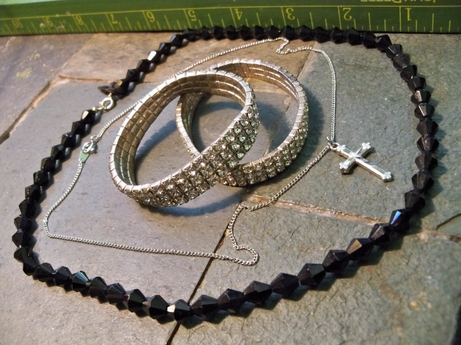 a cure fan's lot OF 4 PCS this is not celebrity worn or owned, just similar bracelets and fan owned punk new wave jewelry . love cats vid jewelry style inspiration and style new wave style lot all true old glass and elastic bracelets rhinestone faux, one MISSING STONE NOTED shown. would be great with a polka dot shirt lol. have fun thanks. old school new wave authentic what was worn then. you get a necklace black glass, a chain, a cross unmarked, a pair of bracelets that are bright and amazing, one stone gone. greenbagstorageLOTOF4GOTH