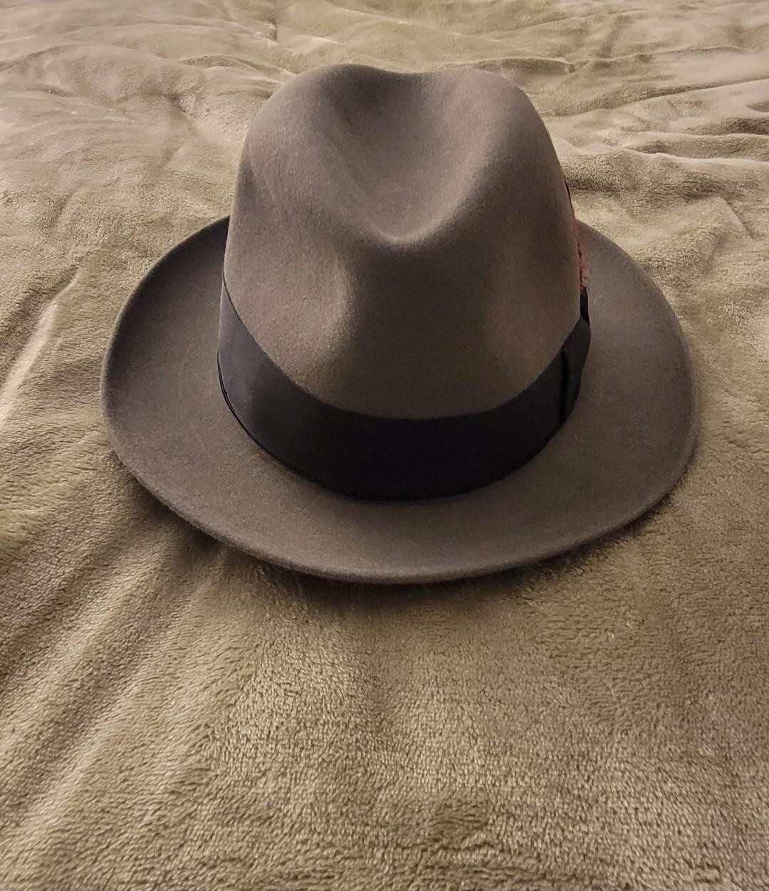 Gray Selentino Rose Classic Fur Felt Fedora hat from the famous JJ Hat Center in NYC. It is size 7 and 1/8 (57), is c rafted with a fine fur-felt finish, the perfect fedora style for classic menswear. This hat is in excellent condition, having only been worn once, and stored for many years in a hat box. It is an extremely high-quality fedora, made of excellent materials, and with a classic look.