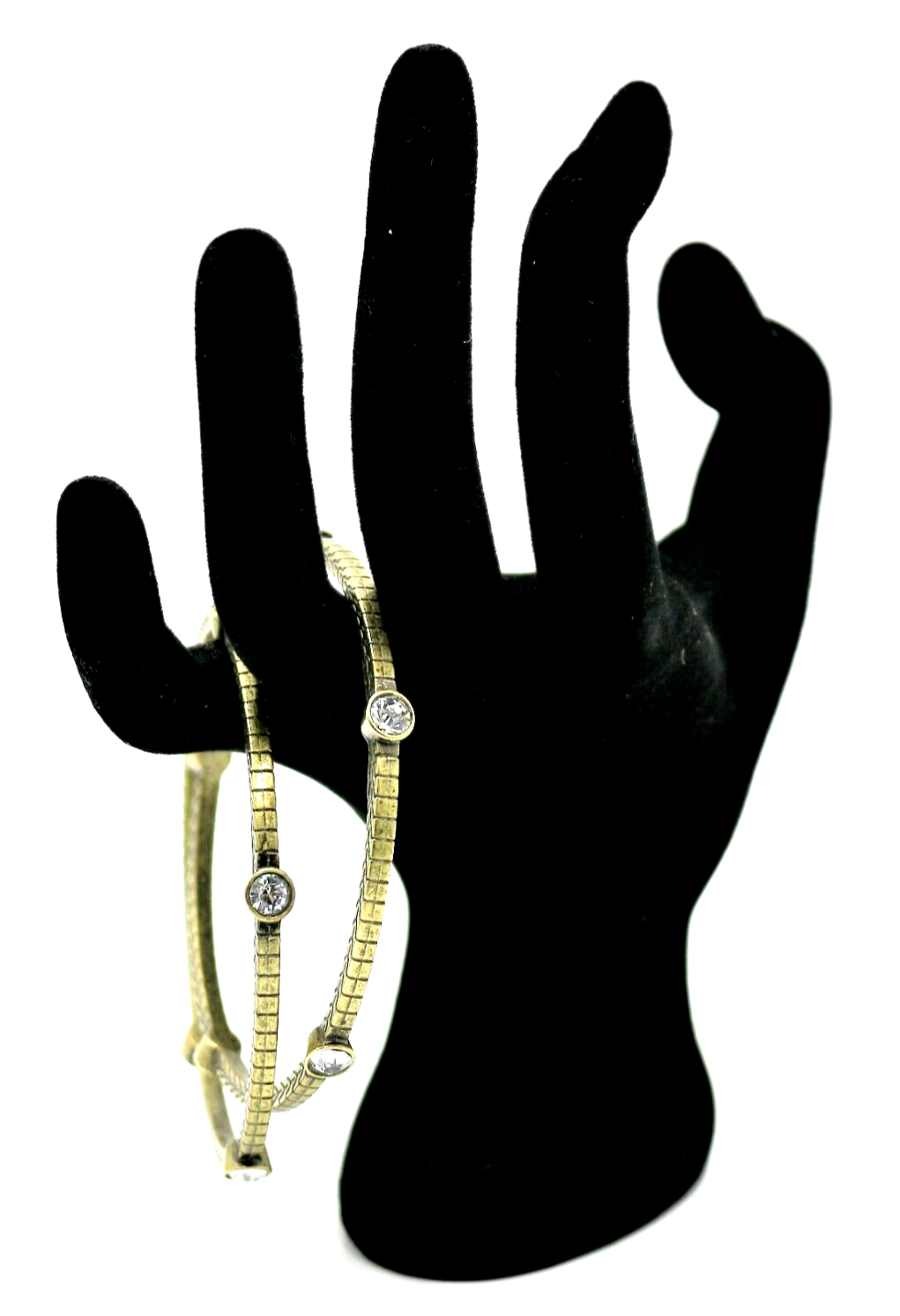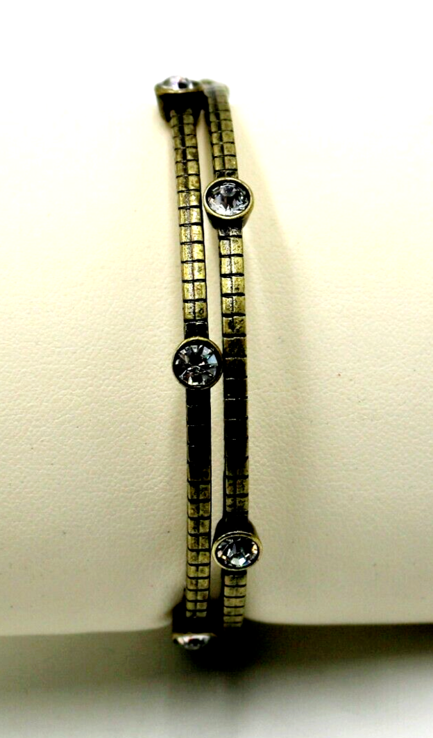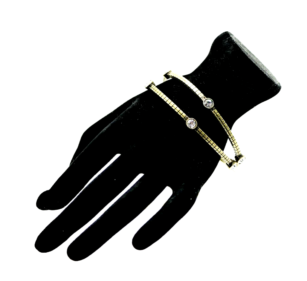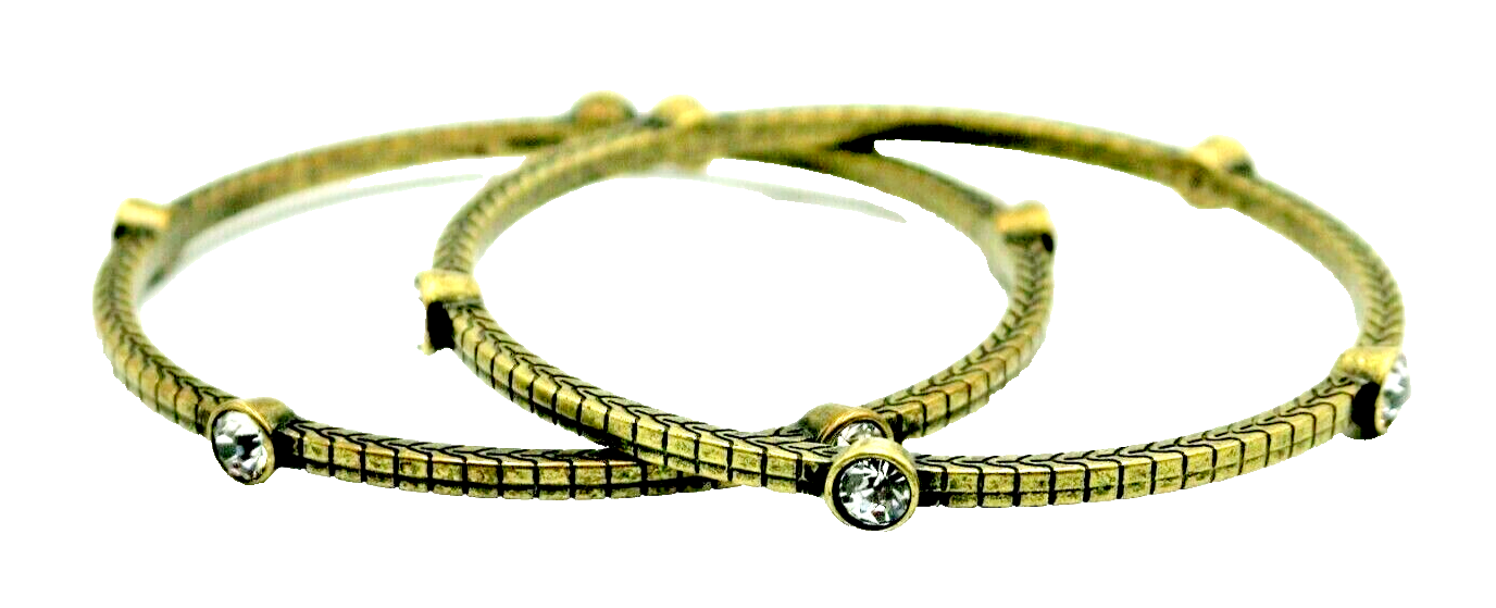Set of two Graziano gold tone stacking bangle bracelets with 5 Rhinestones on each bangle. Very pretty and would dress up any outfit no matter your style, wear them alone or layer them in with your other bracelets. They would make the perfect gift for any of your friends and loved ones. This item is preowned but in great condition, please view all pics and zoom in for further details. Jewelry props are not included in the sale. Visit my store to find more jewelry items and lots of other great gift ideas.