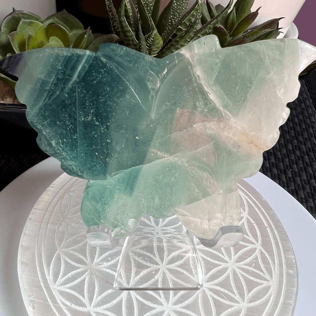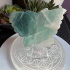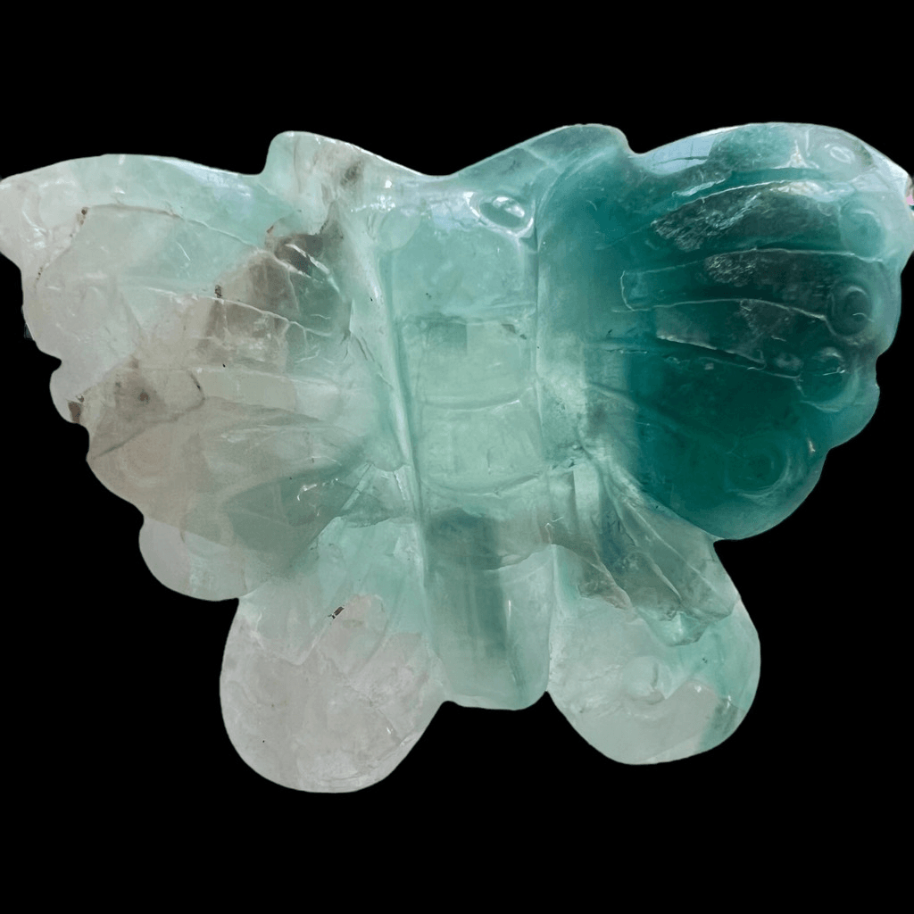 Green Banded Fluorite Crystal Butterfly The small fluorite crystal butterfly carving is a delicate work of art, meticulously crafted from a vibrant, translucent fluorite gemstone. Its iridescent hues of green and blue create a mesmerizing play of colors when held up to the light. Beyond its aesthetic charm, fluorite is believed to possess properties that promote clarity, focus, and emotional balance. This carving, in the form of a butterfly, symbolizes transformation and growth. It's said to bring about positive energy and help one release negativity, making it a beautiful and meaningful addition to any collection or space. Approximate Measurements 77.43 grams 3.56” x 2.32” x 0.54” Please note natural stones are one of a kind and tend to have imperfections. Certian Lighting may alter the crystal’s color display in photos. Smoke Free | Pet Free Environment