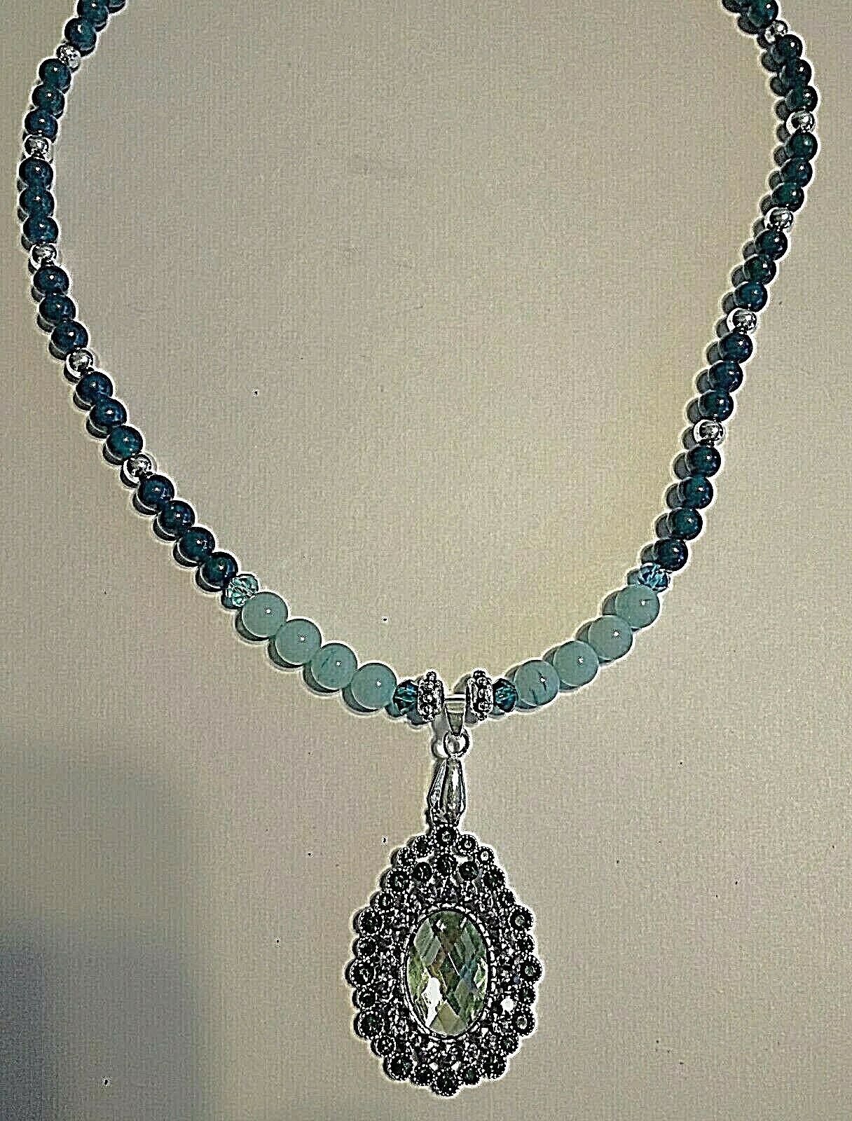 This necklace was made using round beads of various sizes and shades of green and silver. The pendant is comprised of green and clear crystals with a center oval stone of light green. It is finished with a spring ring clasp. The total length with pendant is 22 inches. As with the majority of my pieces it is a one of a kind original.