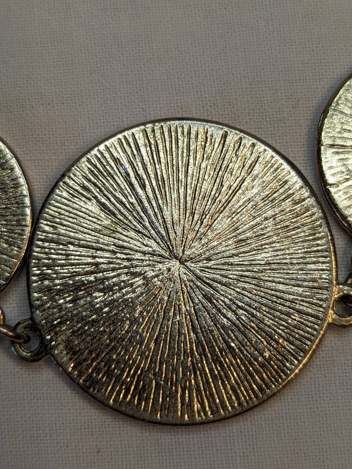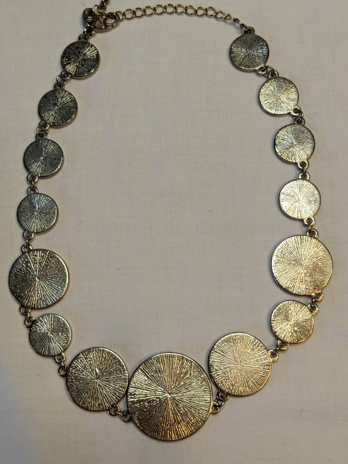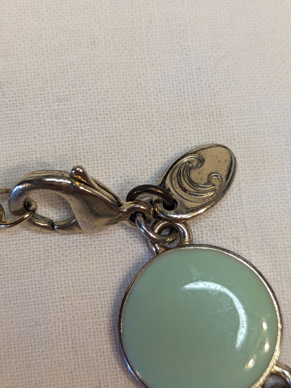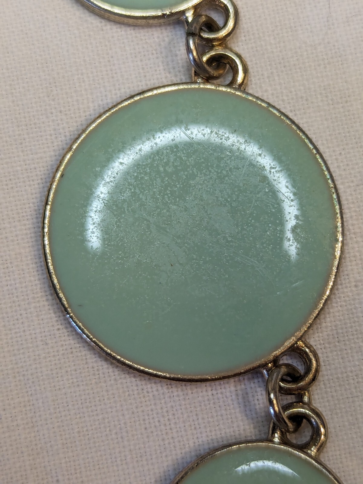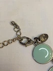 Necklace Green Disks Silver Tone with C Trademark. 20 Inch. Pastel green. Some scuffing and minor scratches