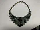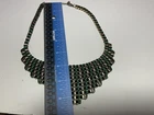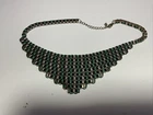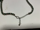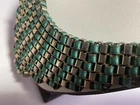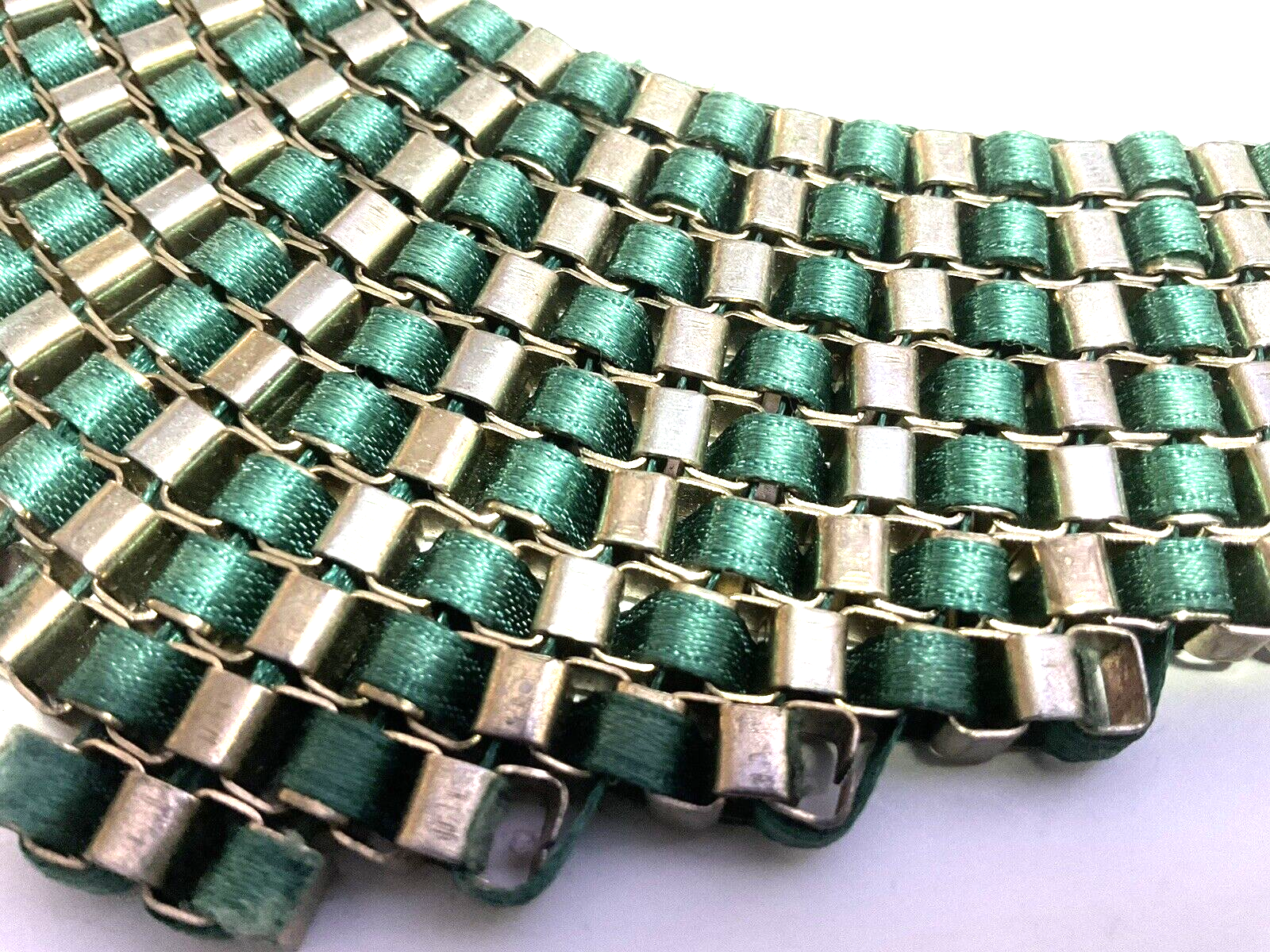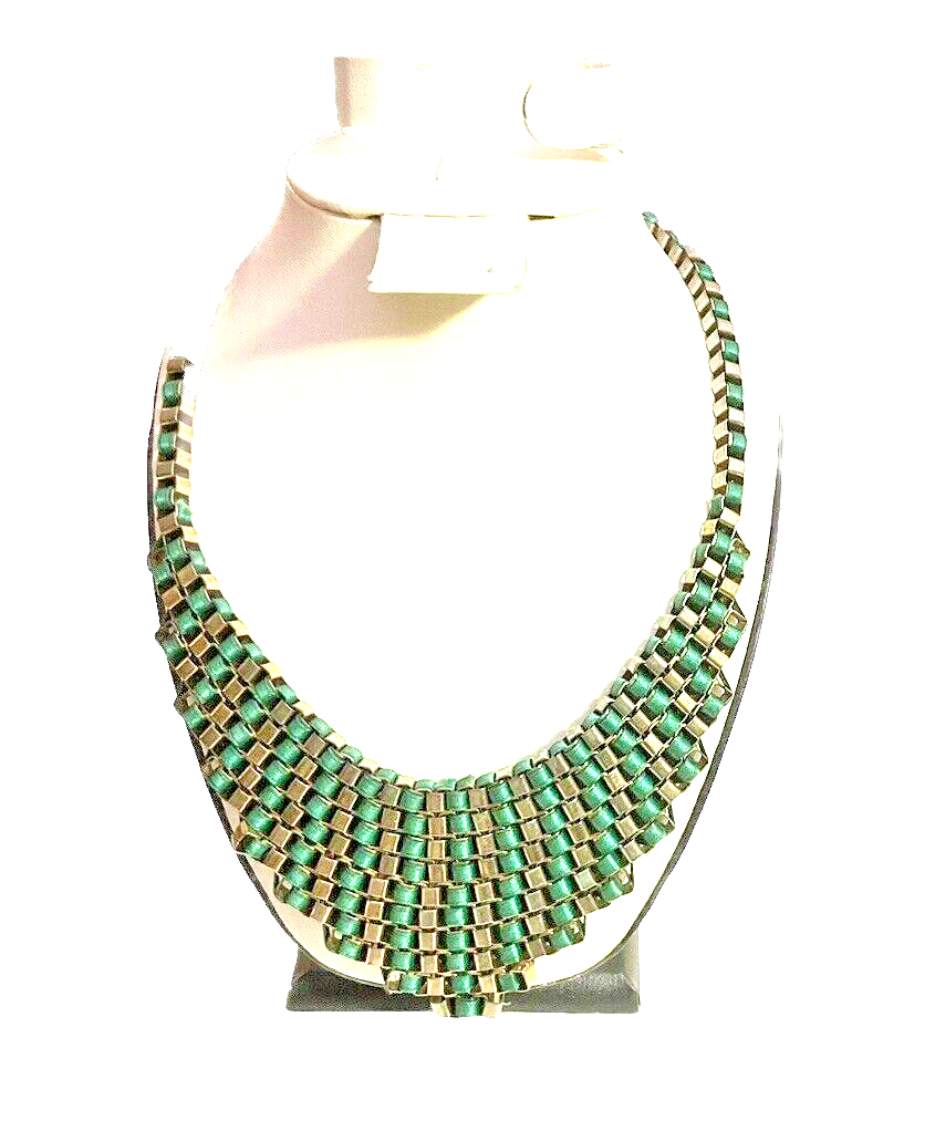 This stunning necklace features a beautiful combination of green ribbon and gold rolled brass stacked with a bib design that adds a touch of elegance to any outfit. The necklace is 16 inches in length, making it the perfect accessory for both casual and formal occasion. The green and gold color adds to your jewelry collection, while the gold tone makes it a versatile piece that can be paired with any outfit. This necklace is a must-have for any fashion-conscious individual who wants to add a touch of sophistication to their wardrobe. 7 oz