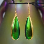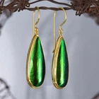 GREEN METALLIC JEWEL BEETLE WING EARRINGS with GOLD VERMEIL over STERLING SILVER – Handmade Item # : 178 0870 1 Type : Handmade earrings with genuine natural Jewel Beetle wing with black Mother-of-Pearl shell backing and 18K Gold Vermeil over solid 925 Sterling Silver. Amount : 1 (one) earring pair * All photos are taken from the actual item * Design : Magnificent drop-shaped JEWEL BEETLE WING EARRINGS with black Mother-of-Pearl backing and a 18K Gold Vermeil over solid 925 Sterling Silver bezel setting from our “Fauna & Flore Collection” Each piece is handmade one by one by master-craftsmen and therefore the shape, size, weight and design may vary slightly. This makes each piece a one-of-a-kind piece of art. Fauna & Flora Celebration Collection : Our celebration collection features vibrant leaves and flowers, as well as captivating creatures, all inspired by nature. Our passion for flora and fauna motivates us to craft these timeless creations. Our collection is dominated by perennial favourites like flowers, leaves, and other natural creations. Our collection has a natural appearance because of the methodical arrangement of colorful gems, carefully selected mother-of-pearl, and stones, which produce a balanced and elegant effect. One of the most delicate and breathtakingly beautiful creatures in the world flutters into our collection. Some of our most magical jewelry is inspired by the butterfly, which is whimsically colorful and so light and graceful on the wing. Pearls, Tsavorites, Rubies, Sapphires, Diamonds and other precious gemstones are prominently used in our creations. Material : Genuine untreated metallic iridescent Jewel Beetle wings, black Mother-of-Pearl and 18K Gold plated solid 925 Sterling Silver Color : Bright metallic green with a stunning silken luster and gold Gold plating : 18K Gold Vermeil 3-micron gold-plated over solid 925 Sterling Silver ~ strong and durable Shape : Teardrop Weight : approx. 4.82 grams Dimensions : Length: approx. 46.95 mm = 1.84 inches Width: approx. 11.46 mm (measured at the widest point) Thickness of shells: approx. 4.57 mm Origin : These Jewel Beetle Wings originate from Thailand are cut and backed with black Mother-of-Pearl in Bali. We buy all Jewel Beetle wing material from farms in Northern Thailand. These drop-shaped Jewel Beetle Wing earring pair is handcrafted in Bali (Indonesia) by o ur in-house Balinese master craftsmen. Origin of Sterling Silver work : Handmade in Bali by our in-house Balinese silversmiths Hallmark stamp : These earrings are hallmark stamped 925 on the bail. Jewel Beetle Wings : Jewel Beetle ~ Buprestidae Because of their glossy, iridescent colors, the Jewel Beetle family, Buprestidae, is sometimes known as metallic wood-boring beetles. In Thailand, these beetles are cultivated, and after their brief lives are over, their wings are harvested. We do not hurt the beetles, so don't worry. We offer them to someone who can skillfully craft exquisite jewelry and who appreciates their exquisite, one-of-a-kind metallic iridescence. What are Jewel Beetles? Buprestidae is a family of beetles, commonly referred to as Jewel Beetles due to the iridescent colors from green, blue, coppery and golden shades. Jewel Beetles are herbivores, which means they only eat plant material. Different species eat different parts of various plants and have different methods of finding a safe place to pupate as a result. All Jewel Beetles have 3 distinct stages of life however, with all of them hatching out of their eggs as larvae before pupating and transforming into their brilliantly colorful adult beetle forms! Larvae of this family are named flatheaded borers, and there are over 15 500 known species of Jewel Beetles! What are Jewel Beetles? The family of beetles known as Buprestidae is popularly called Jewel Beetles because of their dazzling colors! Because they are herbivores, Jewel Beetles exclusively consume plant matter. Because different species use different sections of different plants, they have varied strategies for locating a secure location to pupate. But all Jewel Beetles have three separate life stages: they all emerge from their eggs as larvae, pupate, and then become their amazingly beautiful adult beetle forms! There are more than 15,500 recognized species of jewel beetles, and their larvae are known as flat-headed borers! The three species that we use for our cabochons and jewelry are: Chrysochroa fulminans, Sternocera aequisignata and Sternocera ruficornis. These species are nearly similar, growing to lengths of 30–50 mm (1.2-2 inches), and sharing the same environment. The people of rural Thailand use these Jewel Beetles as a food source, and numerous farms raise them to meet the country's demand. We are unable to distinguish between distinct beetles based solely on their elytra! What are elytra? The portions of a beetle's exoskeleton known as elytra, or "wing-cases," are what cover the wings when they are not in use. If you have ever witnessed a "ladybug" in flight, you have undoubtedly witnessed it unfolding its wings and opening its elytra before taking off for its next destination. Elytra must be both powerful enough to safeguard these vital defence systems and lightweight enough to not impede the beetle's ability to fly and maneuver ! Knowing that earrings and other such items will withstand some banging and clashing over time simply by virtue of being worn out and about is one of the reasons we love integrating them in our jewelry! We use Mother-of-Pearl backing to support these Jewel Beetle wings, giving them even more durability. How do they have such vibrant colors? Jewel Beetles have such vivid, iridescent color because of a process known as structural coloration! In fact, the exoskeleton's microscopic structure tampers with light absorption and reflection, producing a different visual color than would otherwise be reflected. Iridescence is produced when a beetle seems to be one color (green) from one ang
