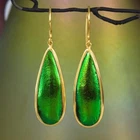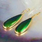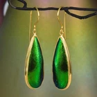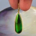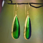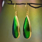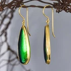 GREEN METALLIC JEWEL BEETLE WING EARRINGS with GOLD VERMEIL over STERLING SILVER – Handmade Item # : 178 0888 Type : Handmade earrings with genuine natural Jewel Beetle wing with black Mother-of-Pearl shell backing and 18K Gold Vermeil over solid 925 Sterling Silver. Amount : 1 (one) earring pair * All photos are taken from the actual item * Design : Magnificent drop-shaped JEWEL BEETLE WING EARRINGS with black Mother-of-Pearl backing and a 18K Gold Vermeil over solid 925 Sterling Silver bezel setting from our “Fauna & Flore Collection” Each piece is handmade one by one by master-craftsmen and therefore the shape, size, weight and design may vary slightly. This makes each piece a one-of-a-kind piece of art. Fauna & Flora Celebration Collection : Our celebration collection features vibrant leaves and flowers, as well as captivating creatures, all inspired by nature. Our passion for flora and fauna motivates us to craft these timeless creations. Our collection is dominated by perennial favourites like flowers, leaves, and other natural creations. Our collection has a natural appearance because of the methodical arrangement of colorful gems, carefully selected mother-of-pearl, and stones, which produce a balanced and elegant effect. One of the most delicate and breathtakingly beautiful creatures in the world flutters into our collection. Some of our most magical jewelry is inspired by the butterfly, which is whimsically colorful and so light and graceful on the wing. Pearls, Tsavorites, Rubies, Sapphires, Diamonds and other precious gemstones are prominently used in our creations. Material : Genuine untreated metallic iridescent Jewel Beetle wings, black Mother-of-Pearl and 18K Gold plated solid 925 Sterling Silver Color : Bright metallic green with a stunning silken luster and gold Gold plating : 18K Gold Vermeil 3-micron gold-plated over solid 925 Sterling Silver ~ strong and durable Shape : Teardrop Weight : approx. 4.94 grams Dimensions : Length: approx. 46.58 mm = 1.83 inches Width: approx. 11.63 mm (measured at the widest point) Thickness of shells: approx. 4.43 mm Origin : These Jewel Beetle Wings originate from Thailand are cut and backed with black Mother-of-Pearl in Bali. We buy all Jewel Beetle wing material from farms in Northern Thailand. These drop-shaped Jewel Beetle Wing earring pair is handcrafted in Bali (Indonesia) by o ur in-house Balinese master craftsmen. Origin of Sterling Silver work : Handmade in Bali by our in-house Balinese silversmiths Hallmark stamp : These earrings are hallmark stamped 925 on the bail. Jewel Beetle Wings : Jewel Beetle ~ Buprestidae Because of their glossy, iridescent colors, the Jewel Beetle family, Buprestidae, is sometimes known as metallic wood-boring beetles. In Thailand, these beetles are cultivated, and after their brief lives are over, their wings are harvested. We do not hurt the beetles, so don't worry. We offer them to someone who can skillfully craft exquisite jewelry and who appreciates their exquisite, one-of-a-kind metallic iridescence. What are Jewel Beetles? Buprestidae is a family of beetles, commonly referred to as Jewel Beetles due to the iridescent colors from green, blue, coppery and golden shades. Jewel Beetles are herbivores, which means they only eat plant material. Different species eat different parts of various plants and have different methods of finding a safe place to pupate as a result. All Jewel Beetles have 3 distinct stages of life however, with all of them hatching out of their eggs as larvae before pupating and transforming into their brilliantly colorful adult beetle forms! Larvae of this family are named flatheaded borers, and there are over 15 500 known species of Jewel Beetles! What are Jewel Beetles? The family of beetles known as Buprestidae is popularly called Jewel Beetles because of their dazzling colors! Because they are herbivores, Jewel Beetles exclusively consume plant matter. Because different species use different sections of different plants, they have varied strategies for locating a secure location to pupate. But all Jewel Beetles have three separate life stages: they all emerge from their eggs as larvae, pupate, and then become their amazingly beautiful adult beetle forms! There are more than 15,500 recognized species of jewel beetles, and their larvae are known as flat-headed borers! The three species that we use for our cabochons and jewelry are: Chrysochroa fulminans, Sternocera aequisignata and Sternocera ruficornis. These species are nearly similar, growing to lengths of 30–50 mm (1.2-2 inches), and sharing the same environment. The people of rural Thailand use these Jewel Beetles as a food source, and numerous farms raise them to meet the country's demand. We are unable to distinguish between distinct beetles based solely on their elytra! What are elytra? The portions of a beetle's exoskeleton known as elytra, or "wing-cases," are what cover the wings when they are not in use. If you have ever witnessed a "ladybug" in flight, you have undoubtedly witnessed it unfolding its wings and opening its elytra before taking off for its next destination. Elytra must be both powerful enough to safeguard these vital defence systems and lightweight enough to not impede the beetle's ability to fly and maneuver ! Knowing that earrings and other such items will withstand some banging and clashing over time simply by virtue of being worn out and about is one of the reasons we love integrating them in our jewelry! We use Mother-of-Pearl backing to support these Jewel Beetle wings, giving them even more durability. How do they have such vibrant colors? Jewel Beetles have such vivid, iridescent color because of a process known as structural coloration! In fact, the exoskeleton's microscopic structure tampers with light absorption and reflection, producing a different visual color than would otherwise be reflected. Iridescence is produced when a beetle seems to be one color (green) from one angle