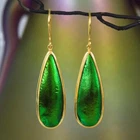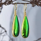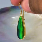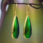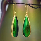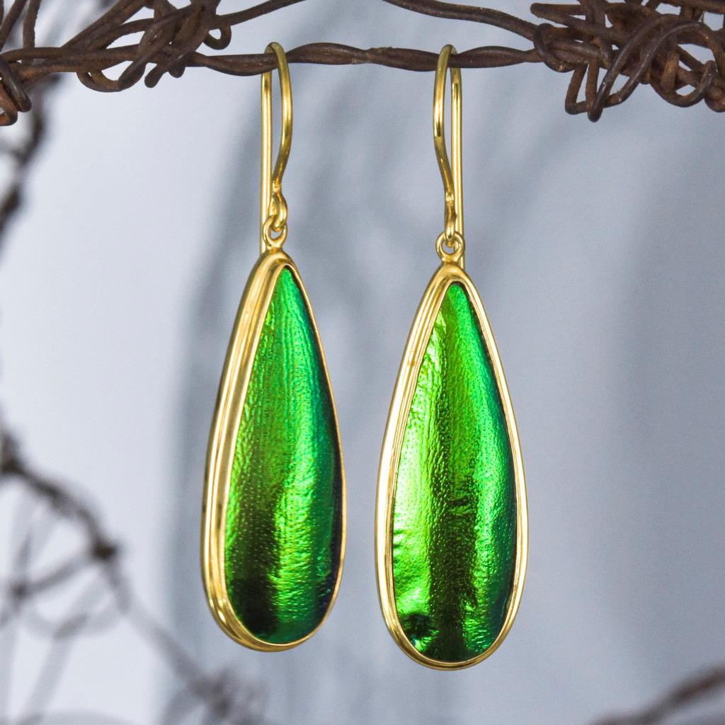 GREEN METALLIC JEWEL BEETLE WING EARRINGS with GOLD VERMEIL over STERLING SILVER – Handmade Item # : 178 0891 Type : Handmade earrings with genuine natural Jewel Beetle wing with black Mother-of-Pearl shell backing and 18K Gold Vermeil over solid 925 Sterling Silver. Amount : 1 (one) earring pair * All photos are taken from the actual item * Design : Magnificent drop-shaped JEWEL BEETLE WING EARRINGS with black Mother-of-Pearl backing and a 18K Gold Vermeil over solid 925 Sterling Silver bezel setting from our “Fauna & Flore Collection” Each piece is handmade one by one by master-craftsmen and therefore the shape, size, weight and design may vary slightly. This makes each piece a one-of-a-kind piece of art. Fauna & Flora Celebration Collection : Our celebration collection features vibrant leaves and flowers, as well as captivating creatures, all inspired by nature. Our passion for flora and fauna motivates us to craft these timeless creations. Our collection is dominated by perennial favourites like flowers, leaves, and other natural creations. Our collection has a natural appearance because of the methodical arrangement of colorful gems, carefully selected mother-of-pearl, and stones, which produce a balanced and elegant effect. One of the most delicate and breathtakingly beautiful creatures in the world flutters into our collection. Some of our most magical jewelry is inspired by the butterfly, which is whimsically colorful and so light and graceful on the wing. Pearls, Tsavorites, Rubies, Sapphires, Diamonds and other precious gemstones are prominently used in our creations. Material : Genuine untreated metallic iridescent Jewel Beetle wings, black Mother-of-Pearl and 18K Gold plated solid 925 Sterling Silver Color : Bright metallic green with a stunning silken luster and gold Gold plating : 18K Gold Vermeil 3-micron gold-plated over solid 925 Sterling Silver ~ strong and durable Shape : Teardrop Weight : approx. 5.10 grams Dimensions : Length: approx. 46.82 mm = 1.84 inches Width: approx. 11.56 mm (measured at the widest point) Thickness of shells: approx. 4.13 mm Origin : These Jewel Beetle Wings originate from Thailand are cut and backed with black Mother-of-Pearl in Bali. We buy all Jewel Beetle wing material from farms in Northern Thailand. These drop-shaped Jewel Beetle Wing earring pair is handcrafted in Bali (Indonesia) by o ur in-house Balinese master craftsmen. Origin of Sterling Silver work : Handmade in Bali by our in-house Balinese silversmiths Hallmark stamp : These earrings are hallmark stamped 925 on the bail. Jewel Beetle Wings : Jewel Beetle ~ Buprestidae Because of their glossy, iridescent colors, the Jewel Beetle family, Buprestidae, is sometimes known as metallic wood-boring beetles. In Thailand, these beetles are cultivated, and after their brief lives are over, their wings are harvested. We do not hurt the beetles, so don't worry. We offer them to someone who can skillfully craft exquisite jewelry and who appreciates their exquisite, one-of-a-kind metallic iridescence. What are Jewel Beetles? Buprestidae is a family of beetles, commonly referred to as Jewel Beetles due to the iridescent colors from green, blue, coppery and golden shades. Jewel Beetles are herbivores, which means they only eat plant material. Different species eat different parts of various plants and have different methods of finding a safe place to pupate as a result. All Jewel Beetles have 3 distinct stages of life however, with all of them hatching out of their eggs as larvae before pupating and transforming into their brilliantly colorful adult beetle forms! Larvae of this family are named flatheaded borers, and there are over 15 500 known species of Jewel Beetles! What are Jewel Beetles? The family of beetles known as Buprestidae is popularly called Jewel Beetles because of their dazzling colors! Because they are herbivores, Jewel Beetles exclusively consume plant matter. Because different species use different sections of different plants, they have varied strategies for locating a secure location to pupate. But all Jewel Beetles have three separate life stages: they all emerge from their eggs as larvae, pupate, and then become their amazingly beautiful adult beetle forms! There are more than 15,500 recognized species of jewel beetles, and their larvae are known as flat-headed borers! The three species that we use for our cabochons and jewelry are: Chrysochroa fulminans, Sternocera aequisignata and Sternocera ruficornis. These species are nearly similar, growing to lengths of 30–50 mm (1.2-2 inches), and sharing the same environment. The people of rural Thailand use these Jewel Beetles as a food source, and numerous farms raise them to meet the country's demand. We are unable to distinguish between distinct beetles based solely on their elytra! What are elytra? The portions of a beetle's exoskeleton known as elytra, or "wing-cases," are what cover the wings when they are not in use. If you have ever witnessed a "ladybug" in flight, you have undoubtedly witnessed it unfolding its wings and opening its elytra before taking off for its next destination. Elytra must be both powerful enough to safeguard these vital defence systems and lightweight enough to not impede the beetle's ability to fly and maneuver ! Knowing that earrings and other such items will withstand some banging and clashing over time simply by virtue of being worn out and about is one of the reasons we love integrating them in our jewelry! We use Mother-of-Pearl backing to support these Jewel Beetle wings, giving them even more durability. How do they have such vibrant colors? Jewel Beetles have such vivid, iridescent color because of a process known as structural coloration! In fact, the exoskeleton's microscopic structure tampers with light absorption and reflection, producing a different visual color than would otherwise be reflected. Iridescence is produced when a beetle seems to be one color (green) from one angle