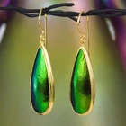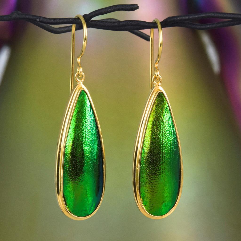 GREEN METALLIC JEWEL BEETLE WING EARRINGS with GOLD VERMEIL over STERLING SILVER – Handmade Item # : 178 0833 Type : Handmade earrings with genuine natural Jewel Beetle wing with black Mother-of-Pearl shell backing and 18K Gold Vermeil over solid 925 Sterling Silver. Amount : 1 (one) earring pair * All photos are taken from the actual item * Design : Magnificent drop-shaped JEWEL BEETLE WING EARRINGS with black Mother-of-Pearl backing and a 18K Gold Vermeil over solid 925 Sterling Silver bezel setting from our “Fauna & Flore Collection” Each piece is handmade one by one by master-craftsmen and therefore the shape, size, weight and design may vary slightly. This makes each piece a one-of-a-kind piece of art. Fauna & Flora Celebration Collection : Our celebration collection features vibrant leaves and flowers, as well as captivating creatures, all inspired by nature. Our passion for flora and fauna motivates us to craft these timeless creations. Our collection is dominated by perennial favourites like flowers, leaves, and other natural creations. Our collection has a natural appearance because of the methodical arrangement of colorful gems, carefully selected mother-of-pearl, and stones, which produce a balanced and elegant effect. One of the most delicate and breathtakingly beautiful creatures in the world flutters into our collection. Some of our most magical jewelry is inspired by the butterfly, which is whimsically colorful and so light and graceful on the wing. Pearls, Tsavorites, Rubies, Sapphires, Diamonds and other precious gemstones are prominently used in our creations. Material : Genuine untreated metallic iridescent Jewel Beetle wings, black Mother-of-Pearl and 18K Gold plated solid 925 Sterling Silver Color : Bright metallic green with a stunning silken luster and gold Gold plating : 18K Gold Vermeil 3-micron gold-plated over solid 925 Sterling Silver ~ strong and durable Shape : Teardrop Weight : approx. 5.26 grams Dimensions : Length: approx. 46.65 mm = 1.83 inches Width: approx. 12.23 mm (measured at the widest point) Thickness of shells: approx. 4.23 mm Origin : These Jewel Beetle Wings originate from Thailand and a cut and back with Mother-of-Pearl in Bali. We buy all Jewel Beetle wing material from farms in Northern Thailand. These drop-shaped Jewel Beetle Wing earring pair is handcrafted in Bali (Indonesia) by o ur in-house Balinese master craftsmen. Origin of Sterling Silver work : Handmade in Bali by our in-house Balinese silversmiths Hallmark stamp : These earrings are hallmark stamped 925 on the bail. Jewel Beetle Wings : Jewel Beetle ~ Buprestidae Because of their glossy, iridescent colors, the Jewel Beetle family, Buprestidae, is sometimes known as metallic wood-boring beetles. In Thailand, these beetles are cultivated, and after their brief lives are over, their wings are harvested. We do not hurt the beetles, so don't worry. We offer them to someone who can skillfully craft exquisite jewelry and who appreciates their exquisite, one-of-a-kind metallic iridescence. What are Jewel Beetles? Buprestidae is a family of beetles, commonly referred to as Jewel Beetles due to the iridescent colors from green, blue, coppery and golden shades. Jewel Beetles are herbivores, which means they only eat plant material. Different species eat different parts of various plants and have different methods of finding a safe place to pupate as a result. All Jewel Beetles have 3 distinct stages of life however, with all of them hatching out of their eggs as larvae before pupating and transforming into their brilliantly colorful adult beetle forms! Larvae of this family are named flatheaded borers, and there are over 15 500 known species of Jewel Beetles! What are Jewel Beetles? The family of beetles known as Buprestidae is popularly called Jewel Beetles because of their dazzling colors! Because they are herbivores, Jewel Beetles exclusively consume plant matter. Because different species use different sections of different plants, they have varied strategies for locating a secure location to pupate. But all Jewel Beetles have three separate life stages: they all emerge from their eggs as larvae, pupate, and then become their amazingly beautiful adult beetle forms! There are more than 15,500 recognized species of jewel beetles, and their larvae are known as flat-headed borers! The three species that we use for our cabochons and jewelry are: Chrysochroa fulminans, Sternocera aequisignata and Sternocera ruficornis. These species are nearly similar, growing to lengths of 30–50 mm (1.2-2 inches), and sharing the same environment. The people of rural Thailand use these Jewel Beetles as a food source, and numerous farms raise them to meet the country's demand. We are unable to distinguish between distinct beetles based solely on their elytra! What are elytra? The portions of a beetle's exoskeleton known as elytra, or "wing-cases," are what cover the wings when they are not in use. If you have ever witnessed a "ladybug" in flight, you have undoubtedly witnessed it unfolding its wings and opening its elytra before taking off for its next destination. Elytra must be both powerful enough to safeguard these vital defence systems and lightweight enough to not impede the beetle's ability to fly and maneuver ! Knowing that earrings and other such items will withstand some banging and clashing over time simply by virtue of being worn out and about is one of the reasons we love integrating them in our jewelry! We use Mother-of-Pearl backing to support these Jewel Beetle wings, giving them even more durability. How do they have such vibrant colors? Jewel Beetles have such vivid, iridescent color because of a process known as structural coloration! In fact, the exoskeleton's microscopic structure tampers with light absorption and reflection, producing a different visual color than would otherwise be reflected. Iridescence is produced when a beetle seems to be one color (green) from one angle and a