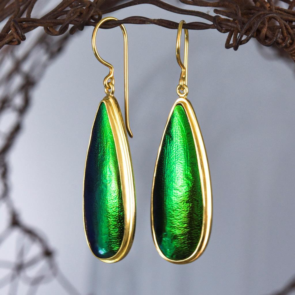 GREEN METALLIC JEWEL BEETLE WING EARRINGS with GOLD VERMEIL over STERLING SILVER – Handmade Item # : 178 0827 Type : Handmade earrings with genuine natural Jewel Beetle wing with black Mother-of-Pearl shell backing and 18K Gold Vermeil over solid 925 Sterling Silver. Amount : 1 (one) earring pair * All photos are taken from the actual item * Design : Magnificent drop-shaped JEWEL BEETLE WING EARRINGS with black Mother-of-Pearl backing and a 18K Gold Vermeil over solid 925 Sterling Silver bezel setting from our “Fauna & Flore Collection” Each piece is handmade one by one by master-craftsmen and therefore the shape, size, weight and design may vary slightly. This makes each piece a one-of-a-kind piece of art. Fauna & Flora Celebration Collection : Our celebration collection features vibrant leaves and flowers, as well as captivating creatures, all inspired by nature. Our passion for flora and fauna motivates us to craft these timeless creations. Our collection is dominated by perennial favourites like flowers, leaves, and other natural creations. Our collection has a natural appearance because of the methodical arrangement of colorful gems, carefully selected mother-of-pearl, and stones, which produce a balanced and elegant effect. One of the most delicate and breathtakingly beautiful creatures in the world flutters into our collection. Some of our most magical jewelry is inspired by the butterfly, which is whimsically colorful and so light and graceful on the wing. Pearls, Tsavorites, Rubies, Sapphires, Diamonds and other precious gemstones are prominently used in our creations. Material : Genuine untreated metallic iridescent Jewel Beetle wings, black Mother-of-Pearl and 18K Gold plated solid 925 Sterling Silver Color : Bright metallic green with a stunning silken luster and gold Gold plating : 18K Gold Vermeil 3-micron gold-plated over solid 925 Sterling Silver ~ strong and durable Shape : Teardrop Weight : approx. 5.82 grams Dimensions : Length: approx. 49.27 mm = 1.93 inches Width: approx. 13.30 mm (measured at the widest point) Thickness of shells: approx. 4.39 mm Origin : These Jewel Beetle Wings originate from Thailand and a cut and back with Mother-of-Pearl in Bali. We buy all Jewel Beetle wing material from farms in Northern Thailand. These drop-shaped Jewel Beetle Wing earring pair is handcrafted in Bali (Indonesia) by o ur in-house Balinese master craftsmen. Origin of Sterling Silver work : Handmade in Bali by our in-house Balinese silversmiths Hallmark stamp : These earrings are hallmark stamped 925 on the bail. Jewel Beetle Wings : Jewel Beetle ~ Buprestidae Because of their glossy, iridescent colors, the Jewel Beetle family, Buprestidae, is sometimes known as metallic wood-boring beetles. In Thailand, these beetles are cultivated, and after their brief lives are over, their wings are harvested. We do not hurt the beetles, so don't worry. We offer them to someone who can skillfully craft exquisite jewelry and who appreciates their exquisite, one-of-a-kind metallic iridescence. What are Jewel Beetles? Buprestidae is a family of beetles, commonly referred to as Jewel Beetles due to the iridescent colors from green, blue, coppery and golden shades. Jewel Beetles are herbivores, which means they only eat plant material. Different species eat different parts of various plants and have different methods of finding a safe place to pupate as a result. All Jewel Beetles have 3 distinct stages of life however, with all of them hatching out of their eggs as larvae before pupating and transforming into their brilliantly colorful adult beetle forms! Larvae of this family are named flatheaded borers, and there are over 15 500 known species of Jewel Beetles! What are Jewel Beetles? The family of beetles known as Buprestidae is popularly called Jewel Beetles because of their dazzling colors! Because they are herbivores, Jewel Beetles exclusively consume plant matter. Because different species use different sections of different plants, they have varied strategies for locating a secure location to pupate. But all Jewel Beetles have three separate life stages: they all emerge from their eggs as larvae, pupate, and then become their amazingly beautiful adult beetle forms! There are more than 15,500 recognized species of jewel beetles, and their larvae are known as flat-headed borers! The three species that we use for our cabochons and jewelry are: Chrysochroa fulminans, Sternocera aequisignata and Sternocera ruficornis. These species are nearly similar, growing to lengths of 30–50 mm (1.2-2 inches), and sharing the same environment. The people of rural Thailand use these Jewel Beetles as a food source, and numerous farms raise them to meet the country's demand. We are unable to distinguish between distinct beetles based solely on their elytra! What are elytra? The portions of a beetle's exoskeleton known as elytra, or "wing-cases," are what cover the wings when they are not in use. If you have ever witnessed a "ladybug" in flight, you have undoubtedly witnessed it unfolding its wings and opening its elytra before taking off for its next destination. Elytra must be both powerful enough to safeguard these vital defence systems and lightweight enough to not impede the beetle's ability to fly and maneuver ! Knowing that earrings and other such items will withstand some banging and clashing over time simply by virtue of being worn out and about is one of the reasons we love integrating them in our jewelry! We use Mother-of-Pearl backing to support these Jewel Beetle wings, giving them even more durability. How do they have such vibrant colors? Jewel Beetles have such vivid, iridescent color because of a process known as structural coloration! In fact, the exoskeleton's microscopic structure tampers with light absorption and reflection, producing a different visual color than would otherwise be reflected. Iridescence is produced when a beetle seems to be one color (green) from one angle and a