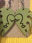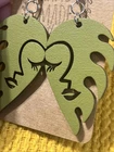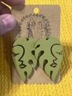 The Green Leaf Lady Earrings are a new, handmade pair of dangle/drop earrings featuring a leaf shape design made from wood. . The earrings are a hand-painted green color and have a nickel-free closure with hooks for easy wear. . Made in the United States, these unique earrings are perfect for those who love flowers and plants, adding a touch of nature to any outfit. . With a length of 3 inches, these earrings are a stylish and fun accessory for any jewelry lover. . The last photo is of the backs of the earrings.