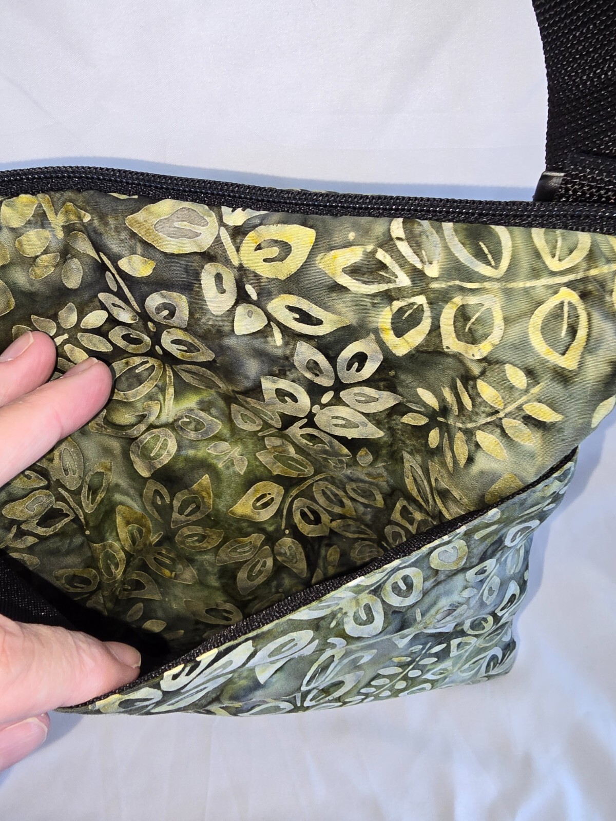 Green Plant Shimmer Crossbody Bag with Adjustable Strap -green pattern with leaves -fabric has a shimmer to it -adjustable black strap -zipper closure -zipper pocket on side -open pocket inside -thin design -Size: 10" depth, 9.5" length -excellent, pre-owned condition Fast shipping! Smoke free home! Please see my other items. Open to offers!