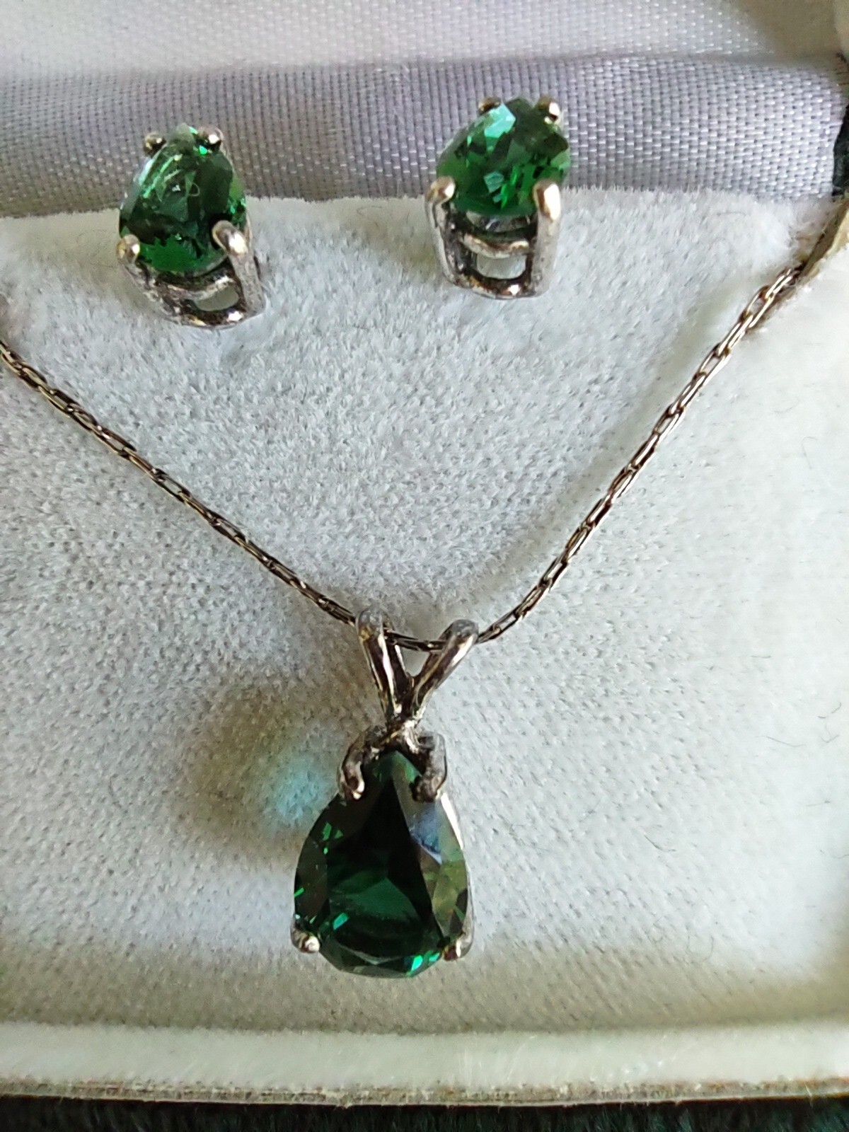 Add a pop of color to your outfit with this stunning green jewelry set. The set includes a pair of stud earrings and a matching pendant necklace, both in a stylish silver tone. The green stones add a touch of nature-inspired elegance to the set. The jewelry set is perfect for adding a touch of class to any outfit. Whether you're dressing up for a night out or dressing down for a casual day, this jewelry set is sure to impress. See pictures selling as is. The chain is very dainty 20"