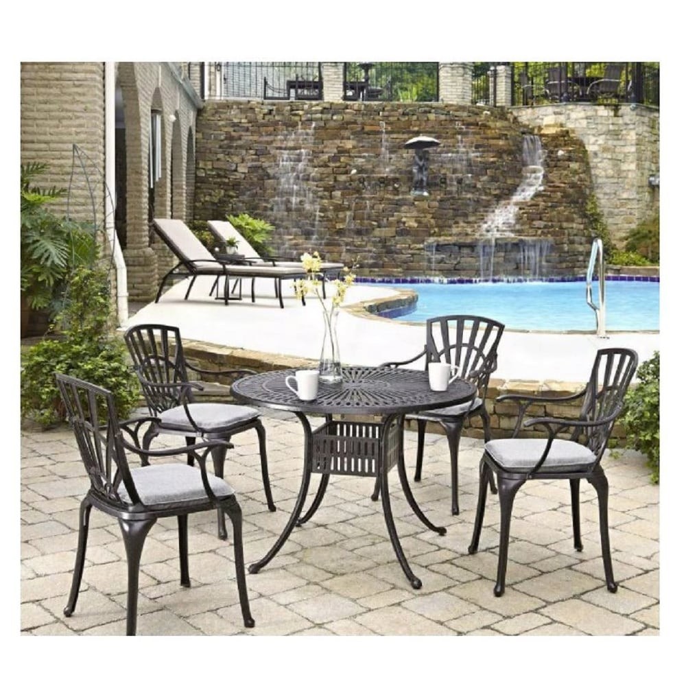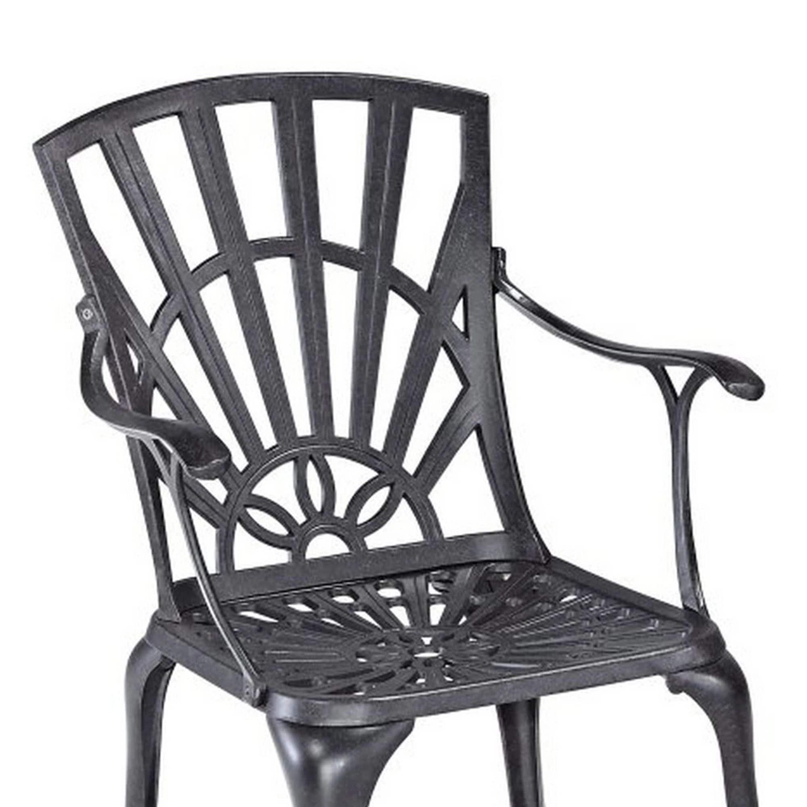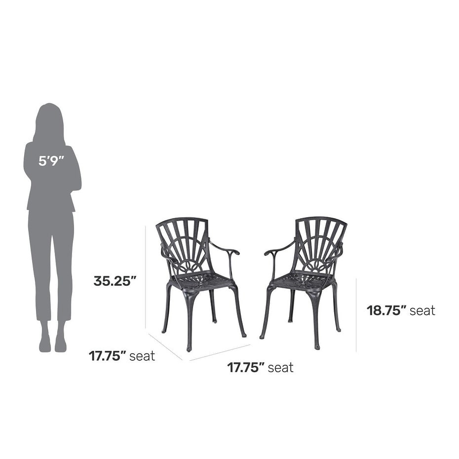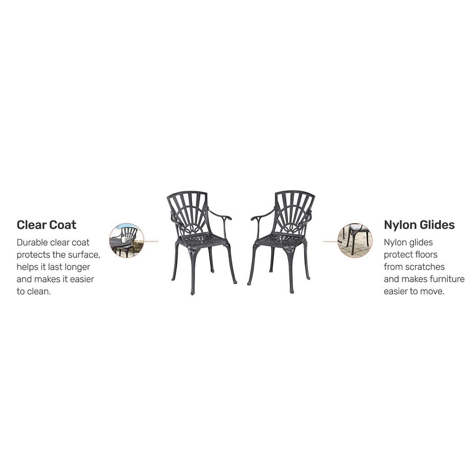 Create paradise in your own backyard. This Grenada pair of arm chairs by homestyles has a cast aluminum frame and is UV-resistant, with a hand-applied, powder-coated finish that's sealed with a clear coat. These chairs pair perfectly with the Grenada Dining Table. The seat design prevents water from collecting and nylon glides help hold it in place. Free Shipping Over $49.99* Details Grenada Outdoor Cast Aluminum Frame Chair Pair by homestyles Product Description: Create paradise in your own backyard. This Grenada pair of arm chairs by homestyles has a cast aluminum frame and is UV-resistant, with a hand-applied, powder-coated finish that's sealed with a clear coat. These chairs pair perfectly with the Grenada Dining Table. The seat design prevents water from collecting and nylon glides help hold it in place.