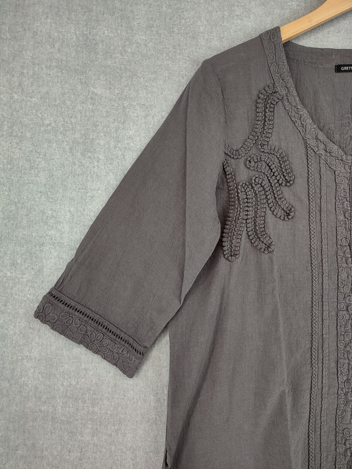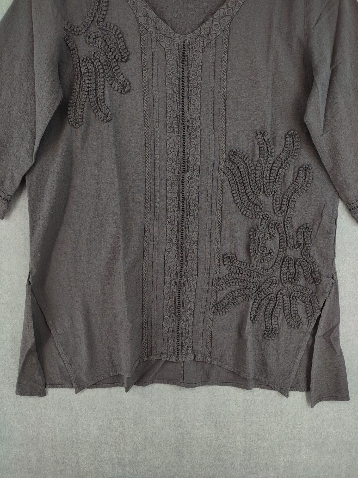 Welcome to Aspen Crossing, offering many styles that reflect the rugged beauty of our American West. Whether your style is Western Bohemian or Quiet Luxury, you’ve come to the right place! Gretty Zueger Top Womens Small Brown Western Bohemian Embroidered Cotton 3/4 Sleeve Pullover Tunic 28.5" LENGTH: Measured from the top of the shoulder to the Hi Lo hem. 20.5" WIDTH: Underarm to underarm, measured flat from left to right. 9.5" SLEEVE LENGTH: Measured from the underarm to the hem. It is always best to compare the measurements above with a top that fits you comfortably. CONDITION - Excellent pre-owned condition, still has tag, never worn. All items are cleaned per Ebay standards. Not spot treated. See the photo gallery to view this items measurements and condition. SHIPPED - USPS Ground Advantage unless item weight requires priority mail. RETURNS accepted, must be returned within 30 days in original condition to receive a full refund. SHIPPING AND HANDLING We ship all packages within five business days Monday through Friday except Holidays. Consolidated shipping is available for multiple purchases. Thank you for helping our planet and buying previously owned and loved items. I am grateful for your business. Enjoy! Check out our eBay store and follow us. There are new listings daily. CUSTOM SKU: 7-1859 Disclaimer: While we make every effort to capture the most accurate depiction of every item when photographing, colors may vary from screen display to in person therefore we cannot guarantee "exact shade" on any item. Message us if you have questions.
