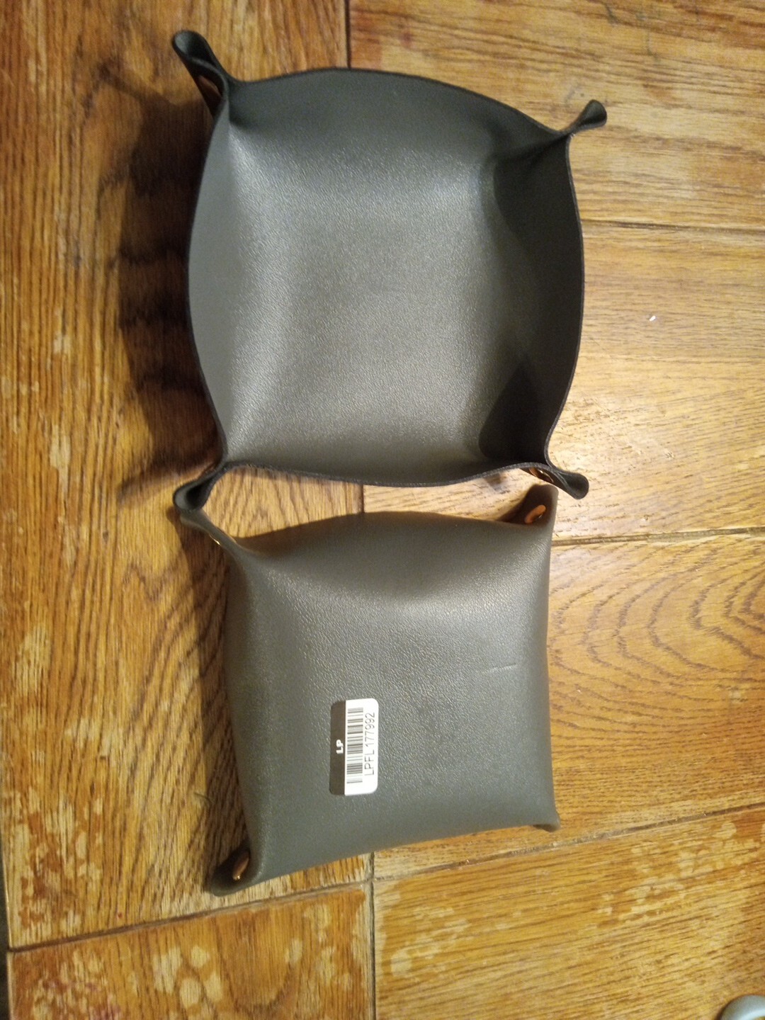 Keep your everyday essentials organized with our Valet Tray an ideal gift and decor accessory hand crafted by artisans using high quality faux leather. 100% Handmade Faux Leather valet tray: catchall, office decor, leather organizer. Grey with gold accents Size: 8x8 inch 2
