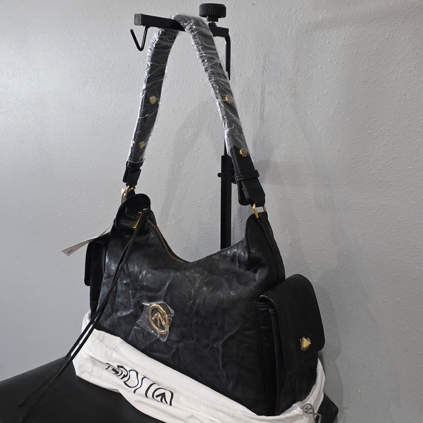 Elegant yet dark new hobo bag that could easily fit almost any outting situation! •Black leather •Gold-toned hardware • Pleated design [Wipe clean - Leather Care]