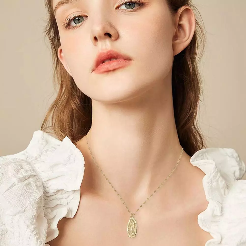 Guadalupe Motif 14K Gold-Plated Charm Pendant with 18" Figaro Chain Choker Religious Significance Symbol of Faith :The Virgin Mary necklace stands as a profound emblem of Catholic and Christian belief, embodying reverence for the Virgin Mary and serving as a tangible expression of prayer. Protection & Blessings :Many believers hold that wearing this necklace invites divine protection and blessings, fostering inner peace and a sense of security. Exquisite Design Meticulous Craftsmanship :Crafted from high-quality copper with electroplated finish, the necklace features intricate detailing, showcasing fine artistry in every curve and contour. Versatile Wear Occasions Daily Elegance :With a minimalist design, it suits everyday wear, blending fashion and dignity seamlessly. Sacred Moments :Ideal for significant religious or life ceremonies—weddings, baptisms, confirmations—where it adds spiritual meaning to the occasion. Thoughtful Gift Options Meaningful Present :An ideal gift for family and friends, especially those with religious faith, it carries profound symbolic value. Commemorative Token :Perfect for marking milestones like birthdays, anniversaries, or graduations, serving as a lasting keepsake with spiritual significance. Item Specifications Product Name :Virgin Mary Necklace Weight :50G Material :Copper with electroplated coating Target Audience :General Circumference :40-45cm Pendant Size :3cm × 1.4cm