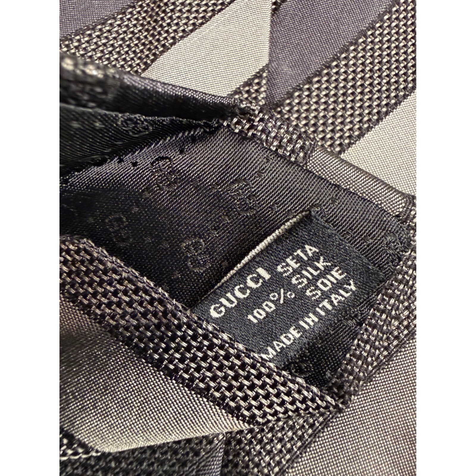Gucci silk necktie features a sophisticated diagonal striped pattern in alternating shades of grey and charcoal. Crafted in Italy from 100% silk, the fabric combines smooth satin-like stripes with textured, woven sections for a rich visual and tactile contrast. The reverse side is finished with a signature GG logo lining and a branded keeper loop, ensuring a polished look for formal or professional attire. Measurements: • Width: 3.75" Keywords: Designer, Luxury, Italian, Formal, Business, Professional, Wedding, Groom, Groomsmen, Classic, Corporate, Silk Tie, Striped, Neutral, Sophisticated, grunge, dark academia