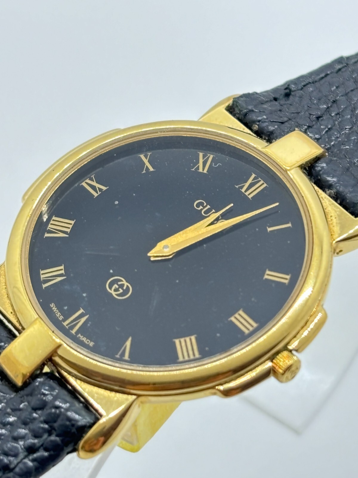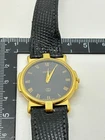 Movement: Quartz Custom Bundle: Yes Model: Gucci 3400F M Dial Color: Black Band Color: Black Case Color: Gold Band/Strap: Bangle Country/Region of Manufacture: Switzerland Bundle Description: Box,Manual. Features: 12-Hour Dial Max Wrist Size: 7.08-7.28 in Case Material: Stainless Steel Display: Analog Indices: Roman Numerals Reference Number: 3400F, 3400F M Watch Shape: Round Type: Wristwatch Brand: Gucci Case Size: 31 mm Style: Casual Bezel Color: Gold Seller Notes: “Please see photos and description.” Department: Men Band Material: Leather Water Resistance: Not Water Resistant