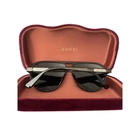 Elevate your style with these iconic Gucci aviator sunglasses. Featuring sleek black frames and gradient lenses, they exude luxury and sophistication. Perfect for sunny beach days, outdoor brunches, or adding a touch of glamour to any outfit. The included velvet case ensures your designer eyewear stays protected. Make a statement and shield your eyes in true Gucci fashion. Keywords: Gucci, aviator, sunglasses, designer, luxury, black, gradient lenses, fashion, accessories, eyewear, UV protection, Italian, style