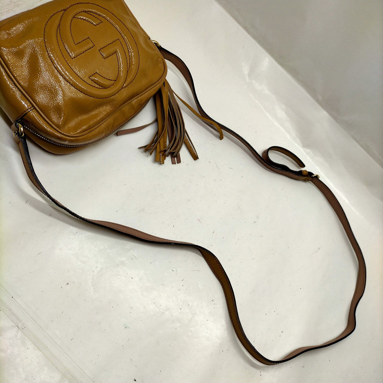 ITEM CONDITION (Outside) Rubs and scratches partially (Outside) Stains partially (Shoulder) Rubs and scratches partially Spots partially (Bottom) Rubs and scratches all over item Spots all over item (Inside) Rubs and scratches partially (Inside) Stains partially (Metal parts) Scratches partially Tarnish partially Width (inch) : 7.48 inch(approx) Width (cm) : 19 cm(approx) Height (inch) : 5.11 inch(approx) Height (cm) : 13 cm(approx) Depth (inch) : 2.75 inch(approx) Depth (cm) : 7 cm(approx) Shoulder/Handle (inch) : 49.21 inch - 53.15 inch Shoulder/Handle (cm) : 125 cm - 135 cm Color : Brown Material :Patent leather Country of Manufacture : Italy Code, Number etc. : 303364498879 General Notes #1 Each item may have a faint smell, even if not specifically stated. #2 If the handle / shoulder strap is adjustable, its maximum length is listed #3 If the item has both a handle and a shoulder strap, the length of the shoulder strap is listed. #4 Nothing comes with unless noted. Selling All of our items are guaranteed to be 100% authentic and genuine brand. All items are inspected by luxury brand item experts and a professional appraisal. Please check the conditions and photos carefully before bidding. If you are not completely satisfied with your purchase, please contact us before leaving neutral or negative feedback. International Buyers - Please Note Import duties, taxes, and charges are not included in the item price or shipping cost. These charges are the buyer's responsibility. Please check with your country's customs office to determine what these additional costs will be prior to bidding or buying. Customs fees are normally charged by the shipping company or collected when you pick the item up. These fees are not additional shipping charges. We are committed to your satisfaction. Please make sure to check our other items as well! Payment Please make payment within 7 days after the auction ends. We ship within 1 business day after receiving payment. Orders will be cancelled if payment is not received within 7 days after purchasing. Shipping We arrange the shipment by EMS or e-packet or DHL. Tracking is available. All items are shipping from Japan. We only ship to the confirmed address provided by eBay site. Before you pay, please make sure your address in eBay matches the address you would like us to ship to. Return If you are not happy with the item you purchased, we will refund your money for the cost you paid for the item. but will not refund the insurance, custom, duties and costs. About us We have sold over 100000 items in Japan over 10 years. We have regular holidays (Sat and Sun) and national holidays on Japan time. Then you can not contact us. We apologize for inconvenience. Thank you for looking and bidding!!