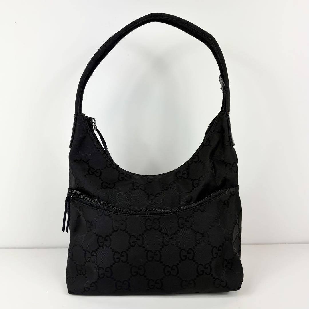 Gucci GG Shima nylon handbag in black. Condition: A, with slight corner scuffing. One of the exterior zipper pulls is a ribbon. There is wear on the leather handles. All zippers open and close smoothly. Size (approximate): Height: 7.09-9.84 inches, Width: 11.81 inches, Depth: 4.72 inches, Handle: 15.75 inches. It is a shoulder bag. There is one interior zipper pocket. Material: Nylon and leather. No accessories are included. I promise fast shipping via FedEx or DHL as soon as possible! Import duties, taxes and charges are not included in the item price or shipping charges. These charges are the buyer’s responsibility. These charges are normally collected by the delivering freight (shipping) company or when you pick the item up - do not confuse them for additional shipping charges.
