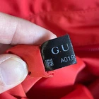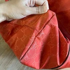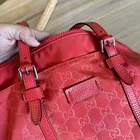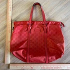 Coral red Gucci Guccissima nylon tote bag with leather trim. This stylish bag features the iconic GG monogram pattern throughout the nylon body, complemented by red leather handles and accents. This authentic Gucci tote combines luxury with practicality, making it a versatile accessory. Condition: good; slight wear throughout, visible wear to corners of bag, and lightening of color on nylon near leather strips. Comes with original box Exterior Material: Nylon, Leather Style: Tote Exterior Color: Juicy Red Department: Women Product Line: Gucci Lining Color: Red/Orange Handle/Strap Color: Red/Orange Handle/Strap Material: Leather Lining Material: Nylon Hardware Color: Silver Pattern: Gucci Micro GG Closure: Zip Accessories: Detachable Strap Keywords: Gucci tote, Gucci handbag, GG nylon bag, coral red bag, designer tote bag, luxury handbag, authentic Gucci, Gucci women's bag, nylon tote, leather trim bag, Gucci vintage, GG monogram, everyday tote, Gucci nylon tote, Gucci red bag