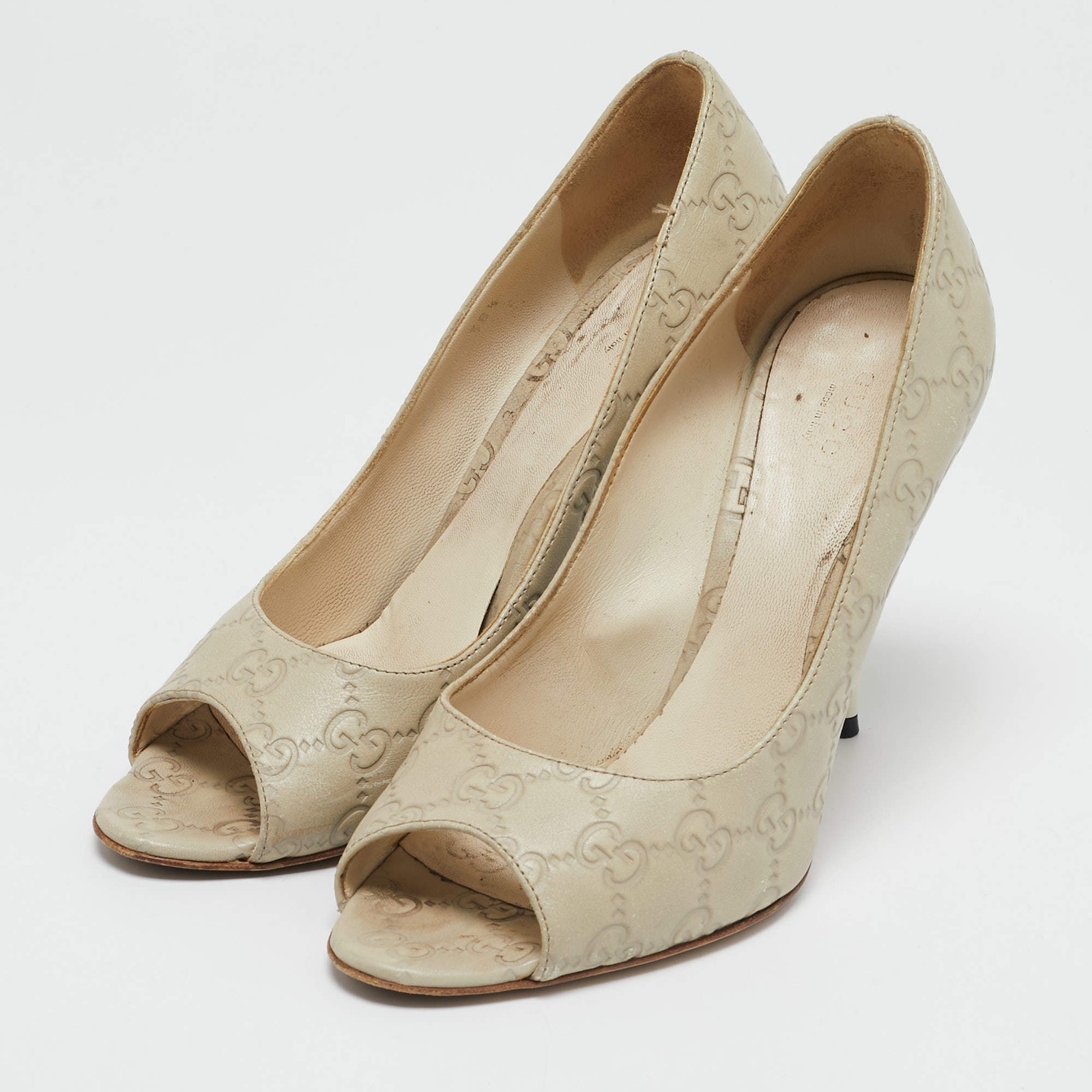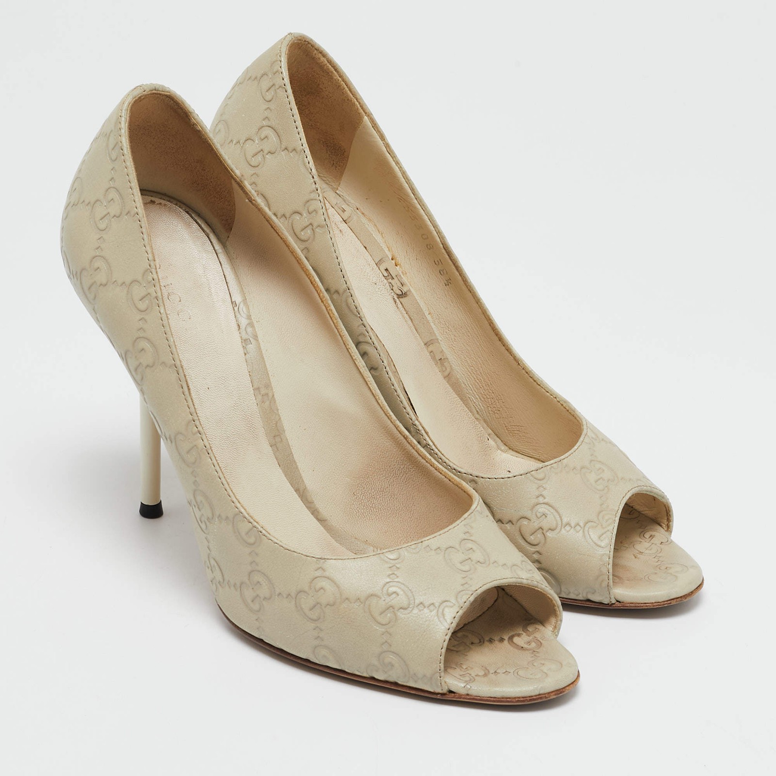 Our eBay Store About Us Contact Us Add to Favorite Sellers Gucci Off White Guccissima Leather Horsebit Peep Toe Pumps Size 385 Gucci’s off-white Guccissima leather pumps offer a feminine touch with peep toes and iconic Horsebit detailing. Elegant and versatile, they work beautifully with both workwear and cocktail attire. Pair with pencil skirts or ankle-length trousers for a refined finish. Product Details Brand Gucci Color White Includes Original Dustbag Outsole Length 22 cm Outsole Width 8.5 cm Size 38.5 Certified by The Luxury Closet This item has gone through a detailed authentication process overseen by our experts. We offer a lifetime guarantee of authenticity on all our items. How We Check The in-house team of experts at The Luxury Closet is highly trained to verify the authenticity and the condition of the luxury products. They ensure that only 100% authentic items are put on sale.The evaluation process is unique with its own mix of assessment criteria and differs according to the category. Each item is evaluated based on the following combination of hallmarks, hardware, stitching, symmetry, material, craftsmanship, stamping, codes, hologram stickers, and packaging. Our authenticators also check if the items have been modified or amended (e.g., aftermarket diamonds, replaced batteries, repaired bags, etc.) International Buyers Import duties, taxes and charges are not included in the item price. These charges are the buyers responsibility. Please check with your country’s customs office to determine what these additional cost will be prior to buying.