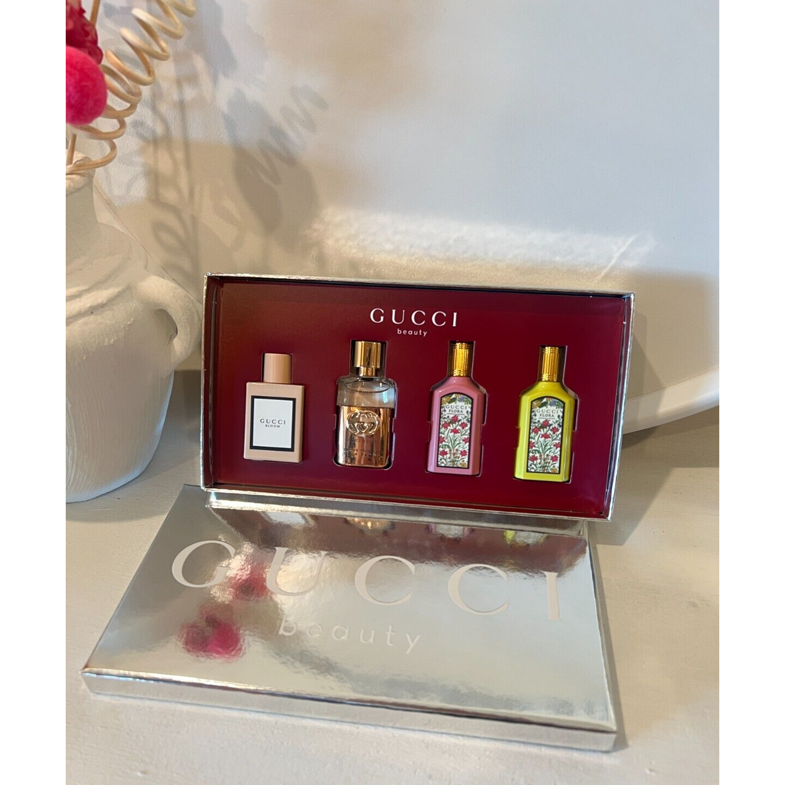 Gucci Women's Mini Perfume Coffret Set Splash Mini Gift Set BRAND NEW | in BOX | NEVER USE | NOT SEALED {CHECK PICTURES FOR PRODUCT REFERENCE} ____________________________________ Share the love and celebrate the festive season with this four-piece Gucci fragrance gift set. Guilty Pour Femme Eau de Parfum is an ambery, floral scent that opens with pink pepper balanced by delicate lilac and grounded by amber and patchouli. Bloom Eau de Parfum for Her is a rich white-floral fragrance that unfolds with rangoon creeper illuminated by jasmine bud. Gucci Flora Gorgeous Gardenia Eau de Parfum is an intensely feminine, floral scent combining the gardenia's first tender blossom with the richness of its flower in full bloom. Flora Gorgeous Orchid Eau de Parfum blends warm vanilla with a refreshing ozonic accord. This Set Contains: Guilty Pour Femme Eau de Parfum - 0.16 oz/ 5 mL Bloom Eau de Parfum For Her - 0.16 oz/ 5 mL Flora Gorgeous Gardenia Eau de Parfum - 0.16 oz/ 5 mL Flora Gorgeous Orchid Eau de Parfum - 0.16 oz/ 5 mL ******** Thank You for visiting our store. PLEASE READ BEFORE PURCHASING! Hope you find what you are looking for. You are always welcome to message us for any questions about our products. NOTE!!! CARDED SAMPLE VIALS are NOT filled to the TOP due to laws regarding the transport of liquid containing alcohol. The content is filled by the manufacturer and is equal to what is listed on the manufacturer's card. As it goes by the amount of liquid inside of them not the size of the bottle, And it is the same way as we bought them. SHIPPING: We ship through USPS FIRST CLASS with tracking number. Items should arrive within 1-6 business days after being shipped (within the USA). We take pride in shipping the items ASAP. Items will be shipped the same day or next day depending on payment/purchased time unless it’s a Weekend or Holidays. RETURNS: Returns are ACCEPTED on NEW, UNUSED & UNOPENED Products. We will Issue Refunds minus $3.99 Shipping Cost. *If you have any special requests, if the item is a Gift feel free to let us know (as all orders will be sent out with a packing slip), We’ll be more than happy to help you out for a personal message.* If you are HAPPY with your Purchase, We will appreciate it if you take your time to leave us a Positive feedback for others to know your experience. Thank You Love! Happy Shopping and Keep on Smiling Loves!