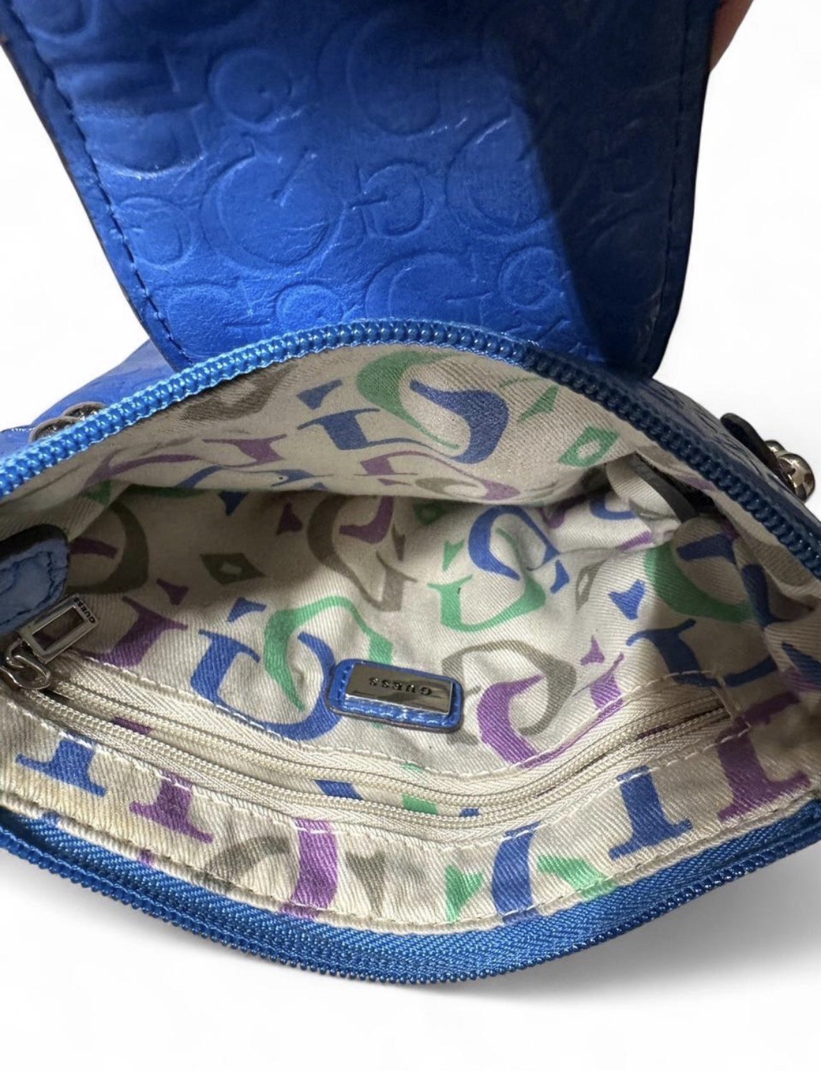 Condition: Pre-owned. Good condition. Light normal wear. See photos for full details. Details: • Guess • Blue Embossed Logo Pattern • Silver Tone G Hardware • Adjustable Crossbody Strap • Flap Front With Snap Closure • Zip Top Compartment • Interior Zip Pocket • Logo Print Lining • Compact Y2K Style Measurements: • 8” x 8” Keywords: Guess Crossbody Bag, Y2K Guess Purse, Mini Shoulder Bag, Small Logo Bag, Blue Guess Handbag, 2000s Style Purse, Embossed Guess Bag, Adjustable Strap Purse, Everyday Crossbody