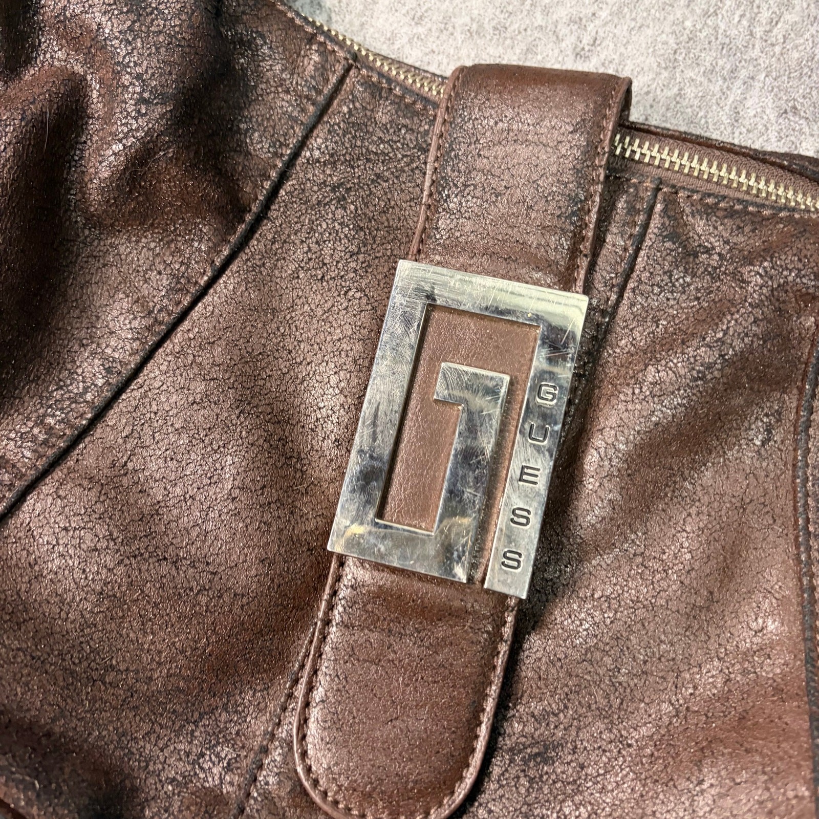Guess Brown Pleather Y2k Rounded Shoulder Bag Brown leather Guess shoulder bag with a curved silhouette and metallic front logo detail. Soft structured body with a classic early-2000s vibe that pairs perfectly with casual or dressed-up looks. A timeless everyday piece with designer appeal. Condition: Good, has cracking please look at photos closely Brand and size: Guess Measurements in photos! All prices are negotiable, bigger discounts for bundles! ALL SALES FINAL!!! Please look at description and all photos. (Final sale excludes shop oversight/related issues) I am just one person and may miss details! All items are clean! Style Tags: guess bag, brown leather purse, y2k handbag, shoulder bag, designer style, everyday bag, vintage inspired